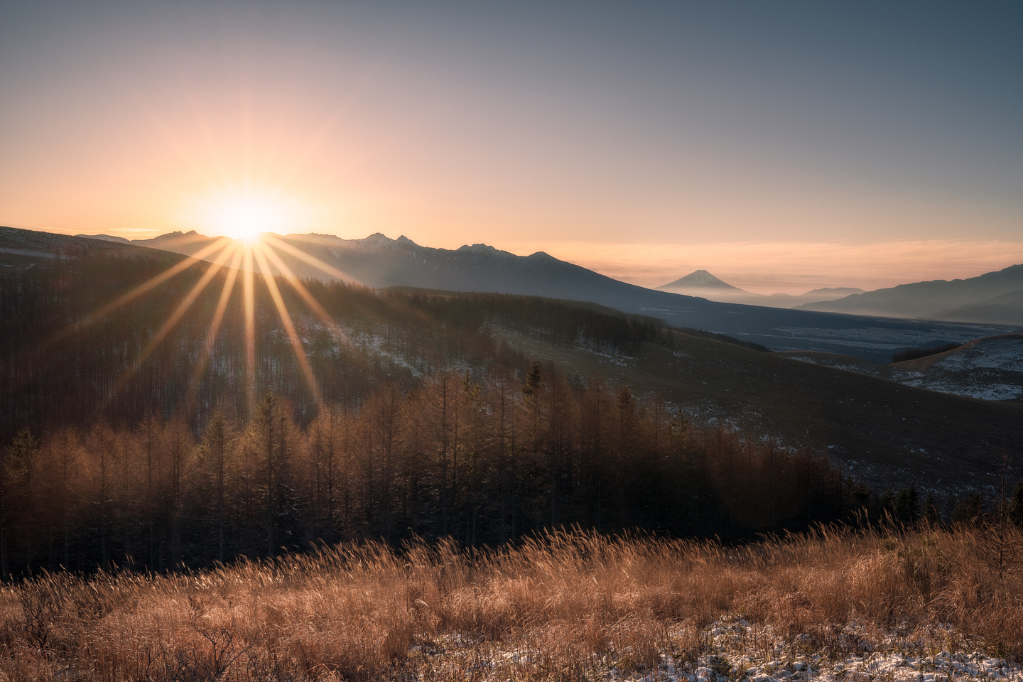 冬に訪れた霧ヶ峰にて。朝日に照らさられたススキと遠くに見える富士山が印象的でした。