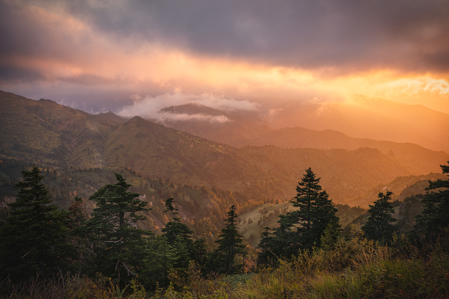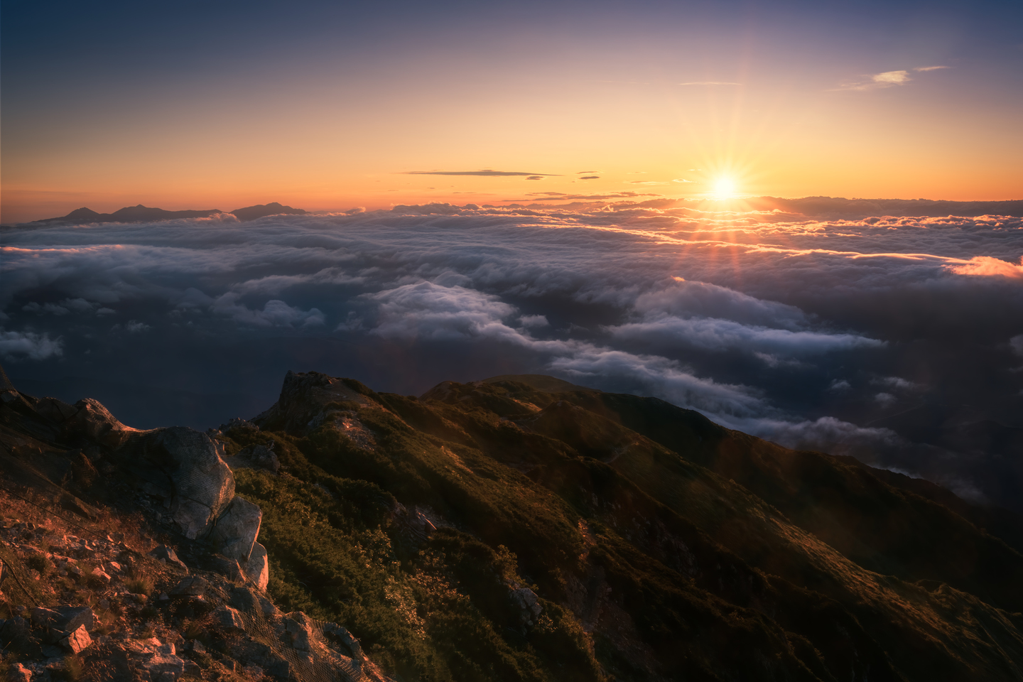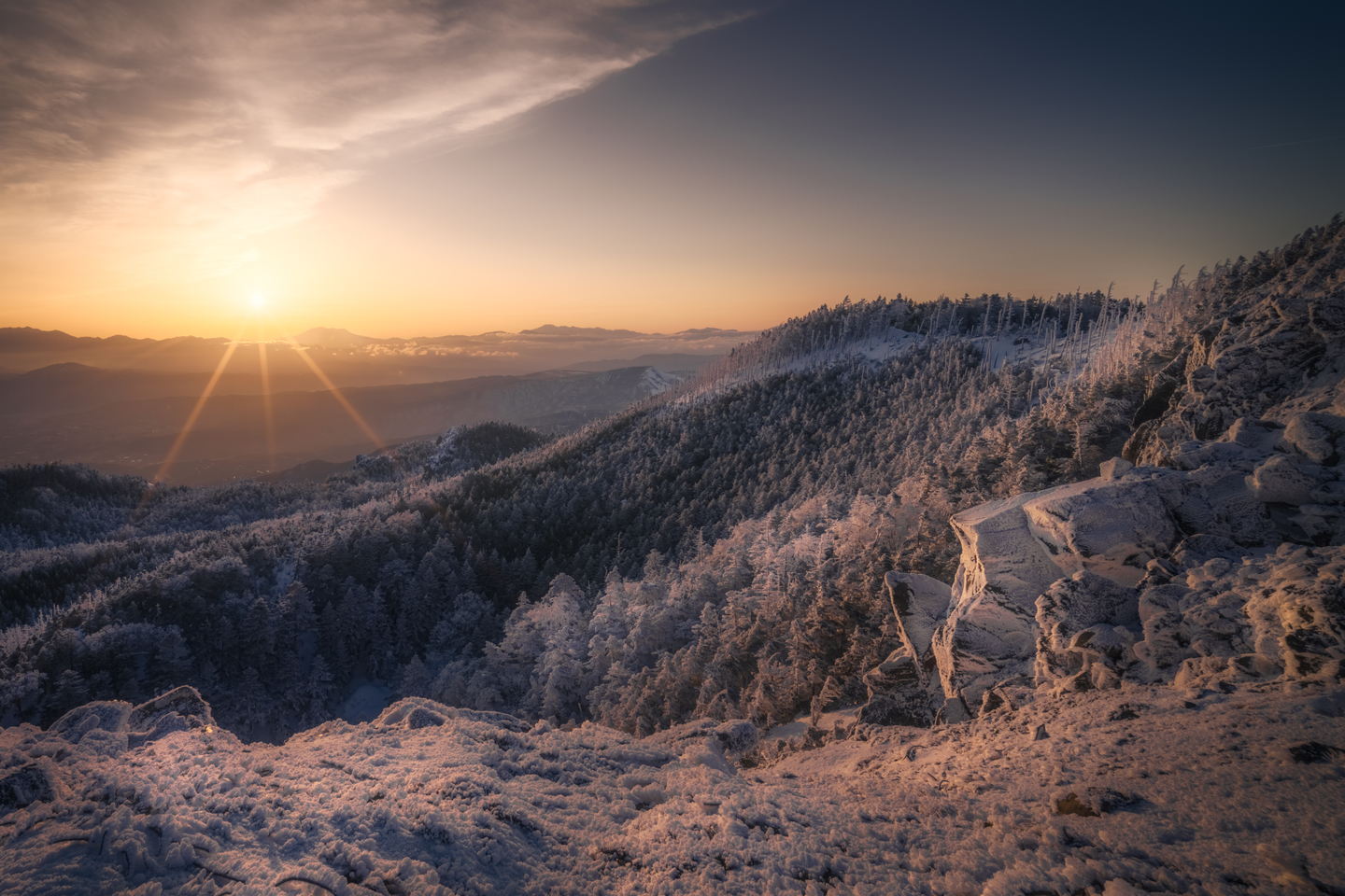 唐松岳からの日の出と雲海を撮影した一枚。朝日が昇り始めるとそれまで濃い雲海で覆われていた山肌が徐々に現れてきました。オレンジ色の光に照らされた岩や山肌を前景とし、遠くの山に見える山々と朝日の構図バランスを意識しています。