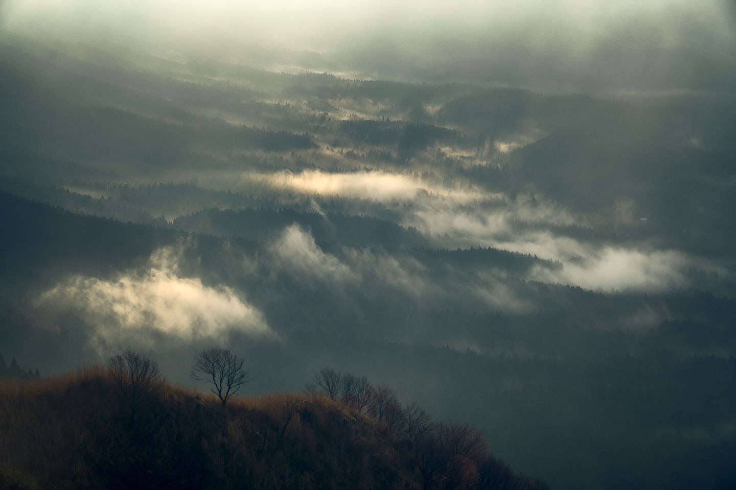 早朝の撮影、現地についたときは少し雨が降っている状況で、もともと撮りたいと考えていたイメージの写真は撮れず少し諦めていましたが、しばらく待っていると時折雲の隙間から差し込む光が予想外の光景を作り出していました。レンズを望遠レンズに変えて撮影した一枚です。