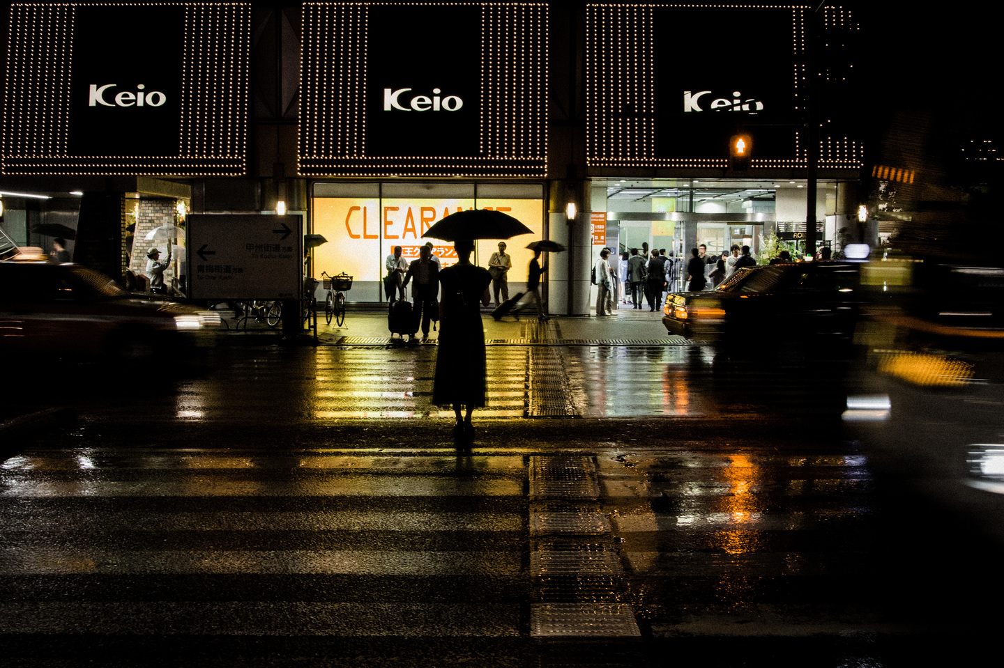雨の夜、信号が変わるまでの数十秒、真ん中で傘を差しながら信号を待つ女性をどう撮るかでこの写真が決まる。まずはKeioの明かりがついているひさしを真っすぐ綺麗に3つ入れたいと思い全体的な構図作りを行った。次に構図の中で傘を持つ女性のシルエットがしっかりと見えるようにカメラの高さを微調整し、通りの向こう側の人影との間に隙間が出来るようにする。この隙間が非常に大事でとにかくメインの被写体と被らないことを意識した。ここでシャッターを切りたくなるところだが、左右に少し流れた車を入れたいので、シャッタースピードを調整してじっと我慢。そして全てがそろったところでシャッターを切る。予想外の事が起きるのが一番面白い写真になるのだが、この様にすべて考えが纏まって、その通りになるのもまたスナップの面白いところだと思う。