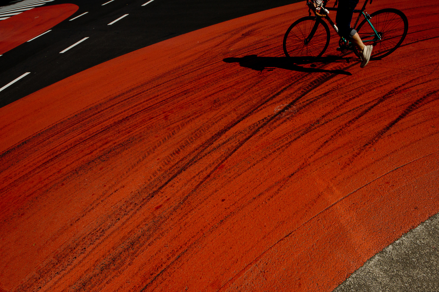 赤い道路に無数のタイヤ痕があったので、それを撮りたいと思った。アクセントをさりげなく入れる事を考え、車だと大きすぎるので自転車がいいかなと思い待つことにした。そこに信号待ちの自転車が現れたので構図づくりをはじめる。交差点の向こう側にはごちゃごちゃした景色があり、そこは入れたくなかったのでカメラを持つ手を上にあげて高い位置からレンズを下向きにして遠くが入らないようにしてから構図を確認。奥行感やバランスを考えると左上の道路の模様は欲しかったのでギリギリ入るようにカメラの向きを微調整する。超広角レンズの端に人や車などを入れると歪んでしまい不自然な形となり、なかなか綺麗な写真にするのは難しいので、腰を境に切り取ることで不自然差を和らげる。上半身の切れてしまったところは影として入れ込んだ。この道路の赤は実際はもう少し柔らかい赤なのだが、ドキッとなるような赤色に編集してインパクトある写真に仕上げた。