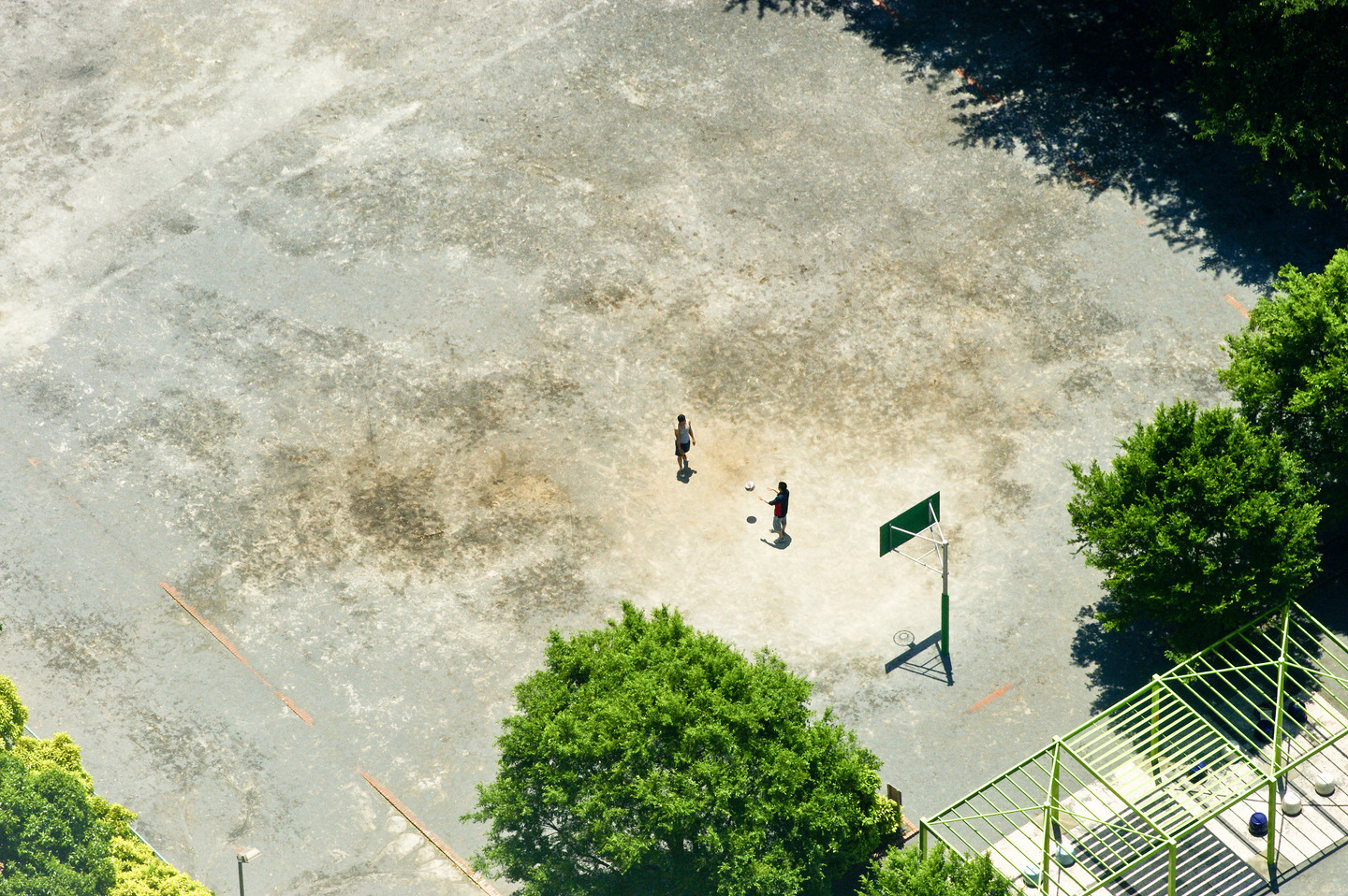展望台は遠くの山や景色を見るところというイメージがあると思うが、都心では特に下を見て回ると面白い瞬間がたくさん見つかる。バスケットをしている二人、ボールが浮くとその影が目立つ。なるべくボールと影がわかりやすい位置に来たところでシャッターを切った。また如何にもバスケットしていますといった体勢や動きが出てしまうと狙っている感が出すぎる為、あえて二人が直立している時に撮影。一生懸命さがでない緩い感じに仕上げてみた。