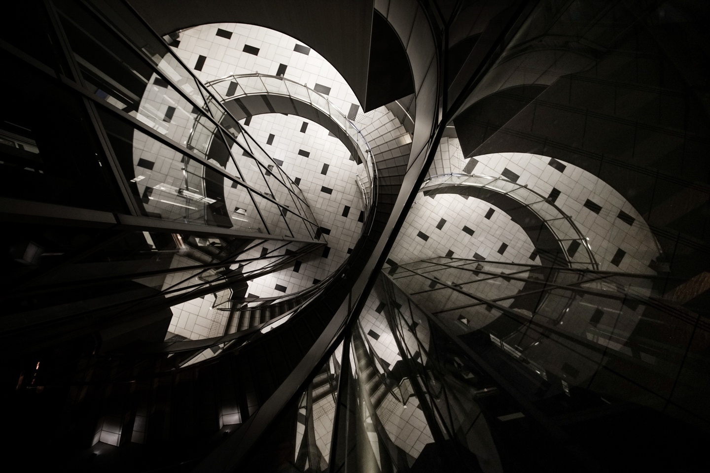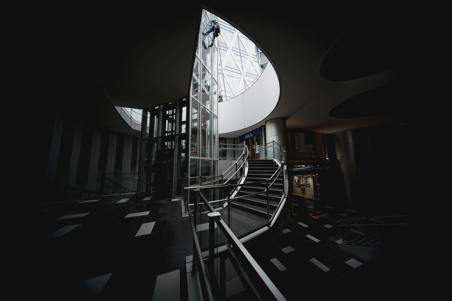 APC-S用の9mmのレンズをフルサイズのカメラに装着してクロップさせずに使用することで、画角はなんとフルサイズで9mm。周辺は真っ黒になるが、元々周辺が暗い場所ではこの様な使い方が可能になる。出来るだけ下がって、余計なものが入りだしたら少し前に出て構図を固定する。その後に人の位置と形を見て撮影した。カラーで撮っているものの、色は少ない方が好きなので彩度を少し下げて仕上げた。
