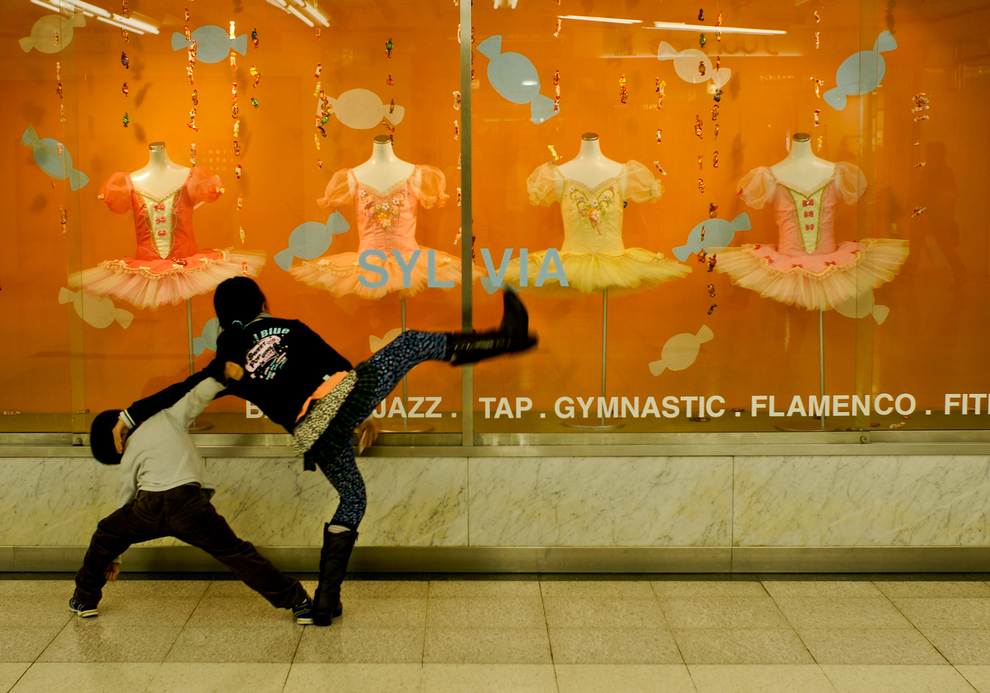 娘のバレーシューズを買いに出かけた時のこと。四つ並んだバレエの衣装がかわいくディスプレイされているのを見た下の子がお姉ちゃんのバレエの真似をしたところ、お姉ちゃんの怒りを買って、もみ合いになっている場面(笑)。この様な決定的な場面を見てしまうとどうしてもレンズをメインの被写体(子供)に向けてしまいがちだが、そこを我慢して2番目に見てほしい衣装の並びを正面に撮影した。 被写体を追いかけないことによって全体として理想的な構図を守りつつ、瞬間をとらえる写真になったと思う。