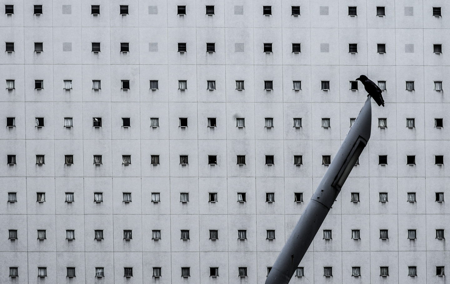 ビルを撮るときは広角系のレンズを使うことが多いと思うが、望遠ズームでの切り取りも面白い。今回の場合はカラスになるがワンポイントとなるものは遠くの窓となるべく被らないようにする。そして背景ボケを少なくして沢山の窓をくっきり写したいので絞り気味に撮影した。