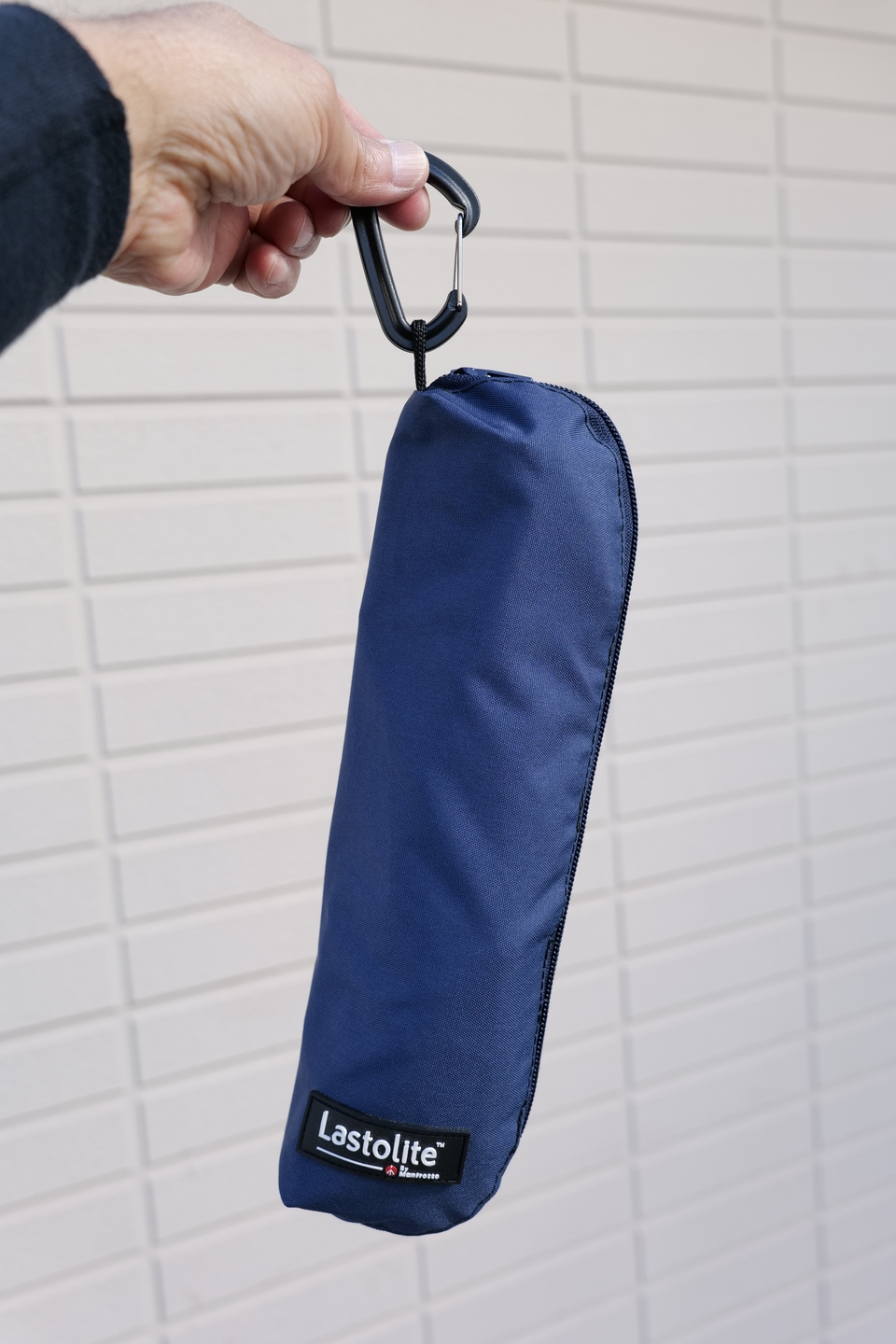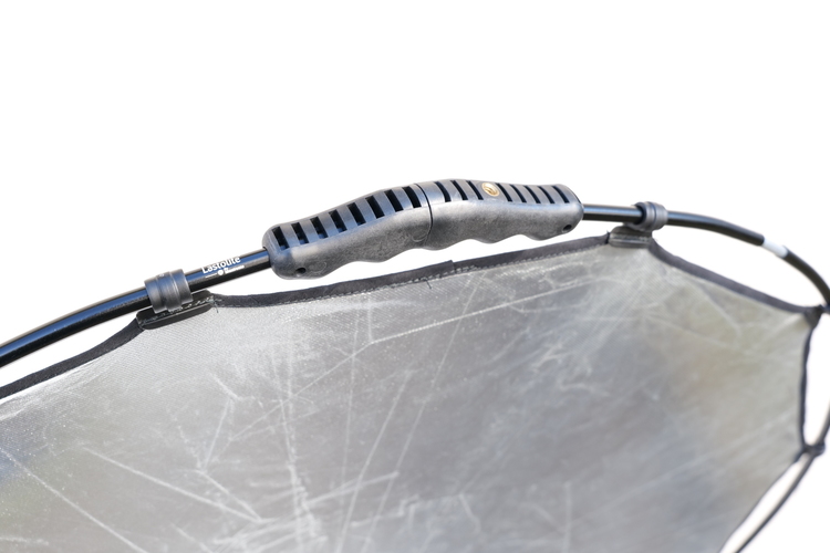 折り畳むとペットボトル代のコンパクトさ。小さめの折りたたみ傘くらいでしょうか。カラビナも付属しているので、カメラバッグにひっかけることもできます。軽くかさばらないので気軽に持ち歩くことも可能ですし、家での収納場所にも困りません。ディフューザーとレフの両方を携行するのも楽チンです。