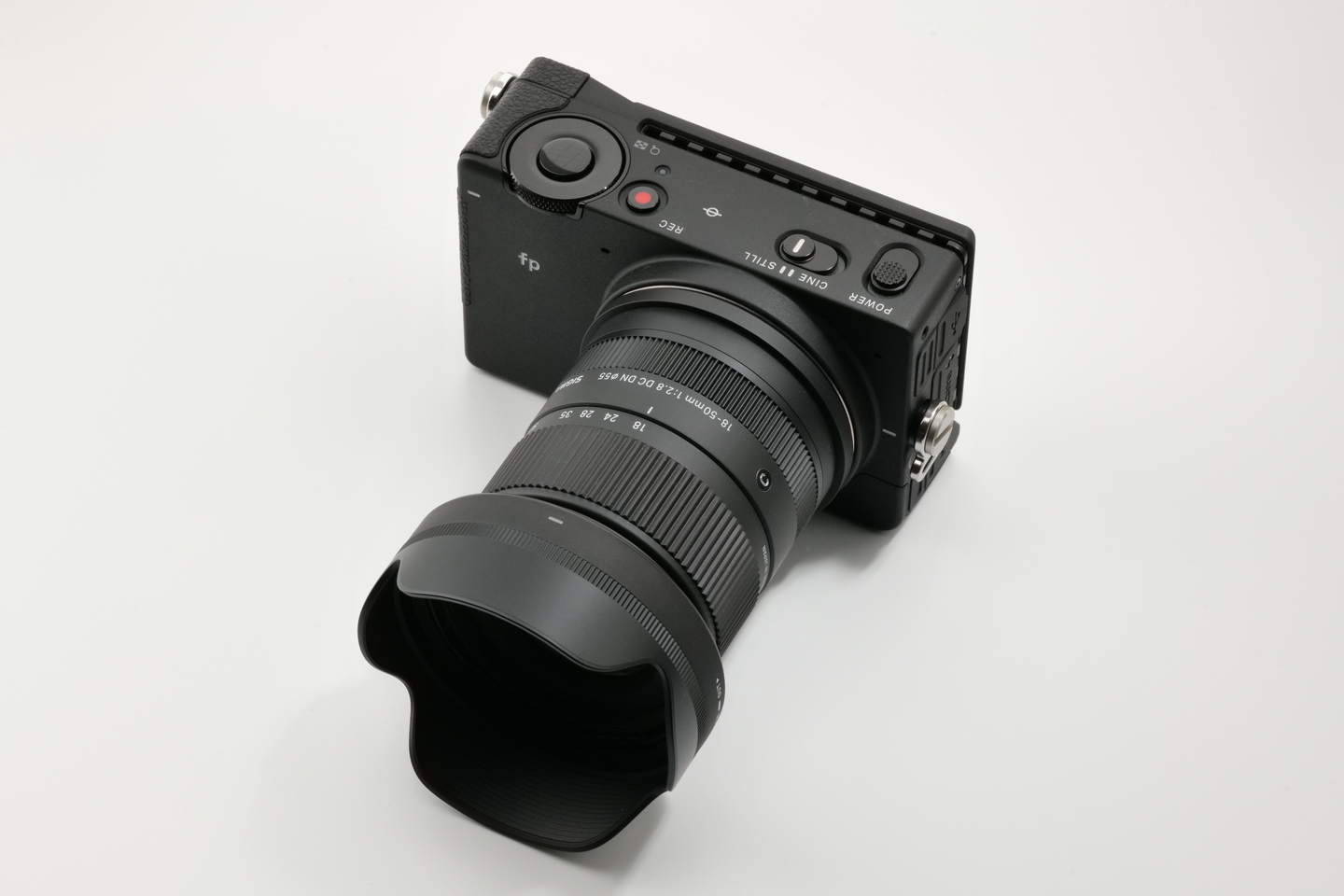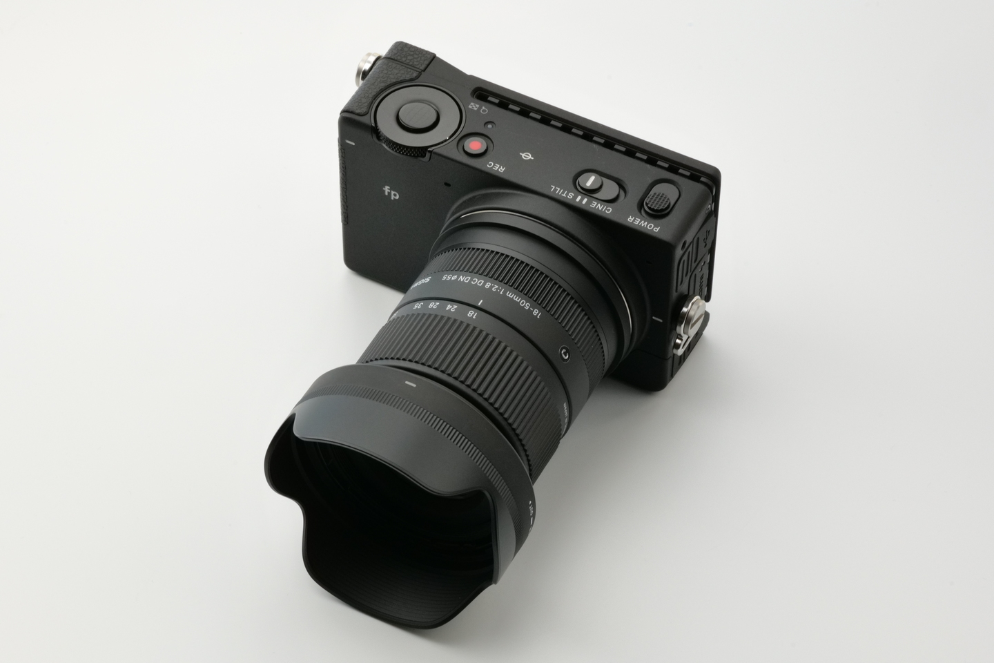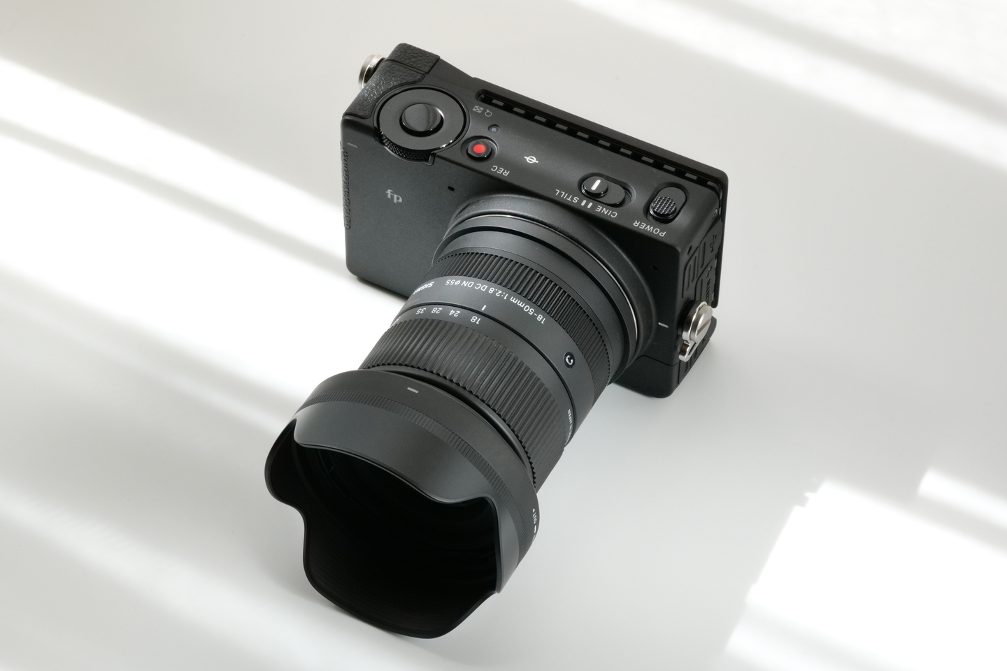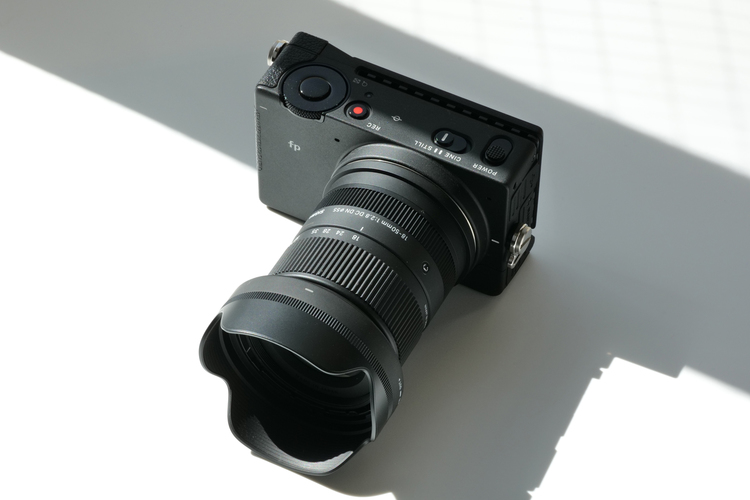 バック紙の中央に被写体となるカメラを置きます。今回は「SIGMA fp」と「SIGMA 18-50mm F2.8 DC DN | Contemporary」のセットを起用しました。