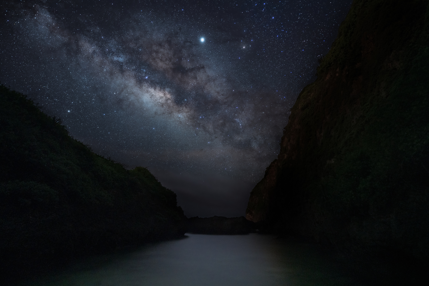 岸壁に囲まれた入江からのぞく天の川を撮影。入り江のような海岸では地形を生かした撮影を楽しむことができます。