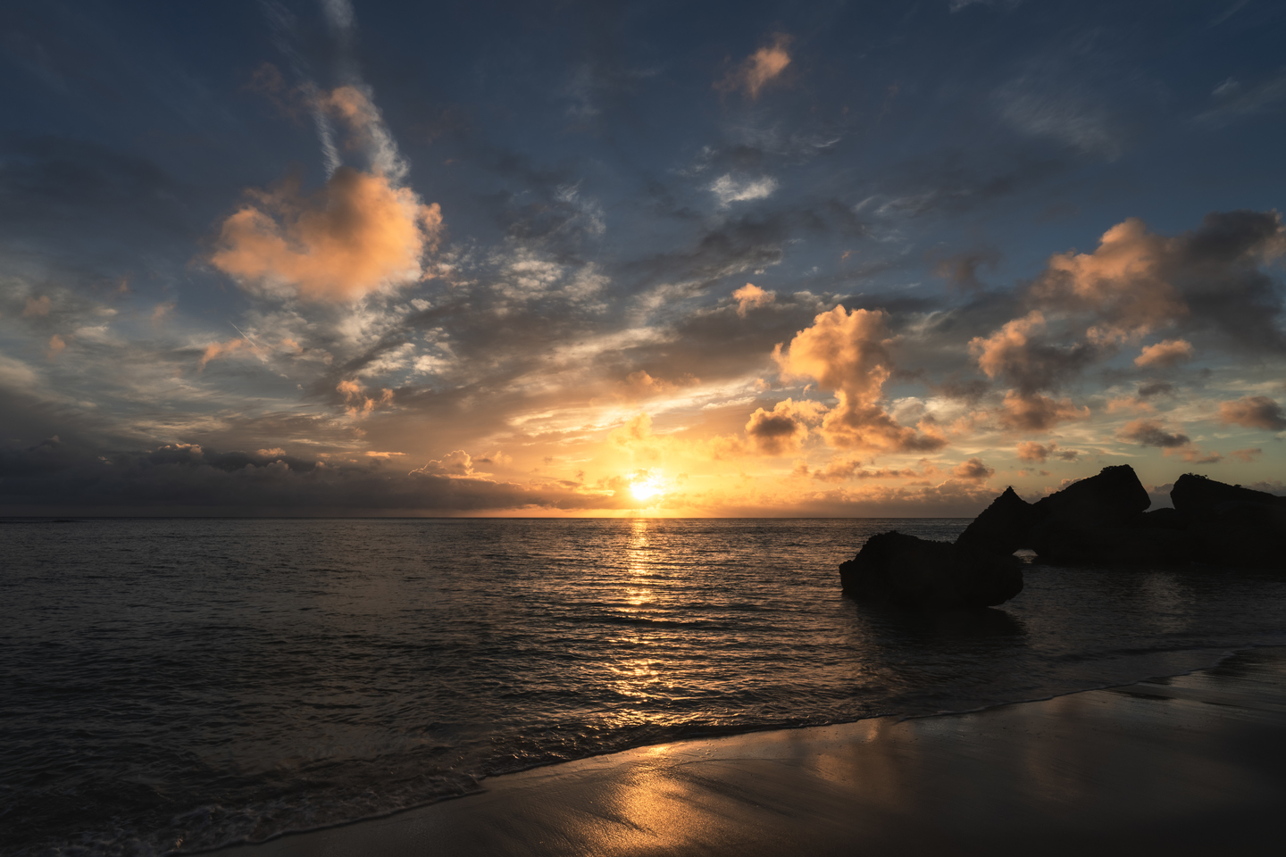 沖縄県・宮古島の海岸で撮影した1枚。朝日のオレンジ色の光に染まる砂浜と雲が印象的でした。広角レンズで撮影することで空と海のダイナミックさを強調しています。