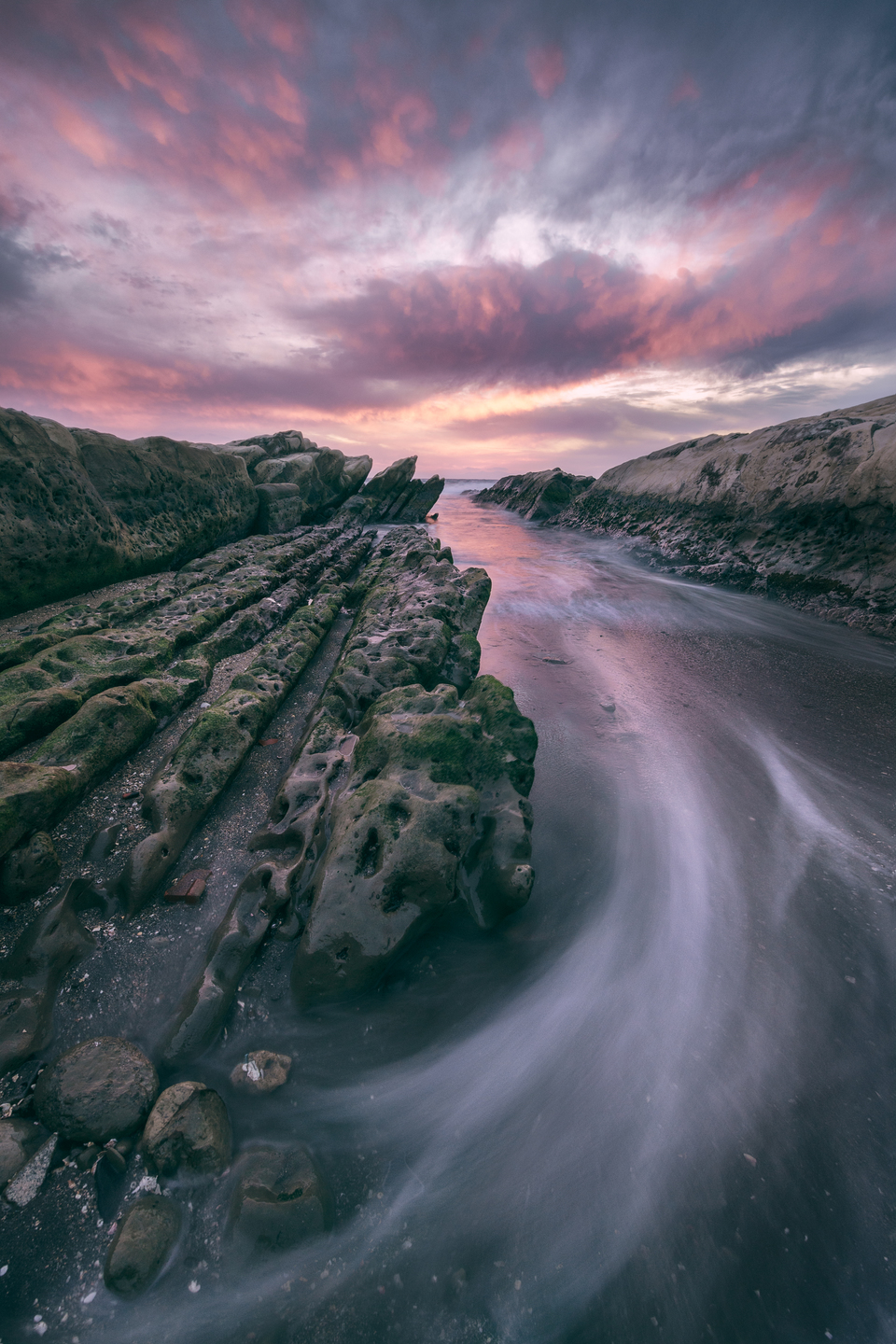 面白い地形の海岸での撮影だったため、地形の作り出すラインと波が引く様を手前の低い位置から広角レンズで縦構図撮影しています。自然が作り出すラインを意識し、視線を手前から奥に惹きつけるようなイメージで撮影するとこのような写真になります。