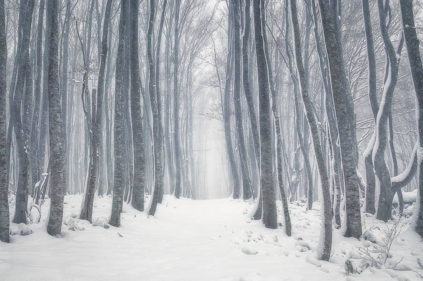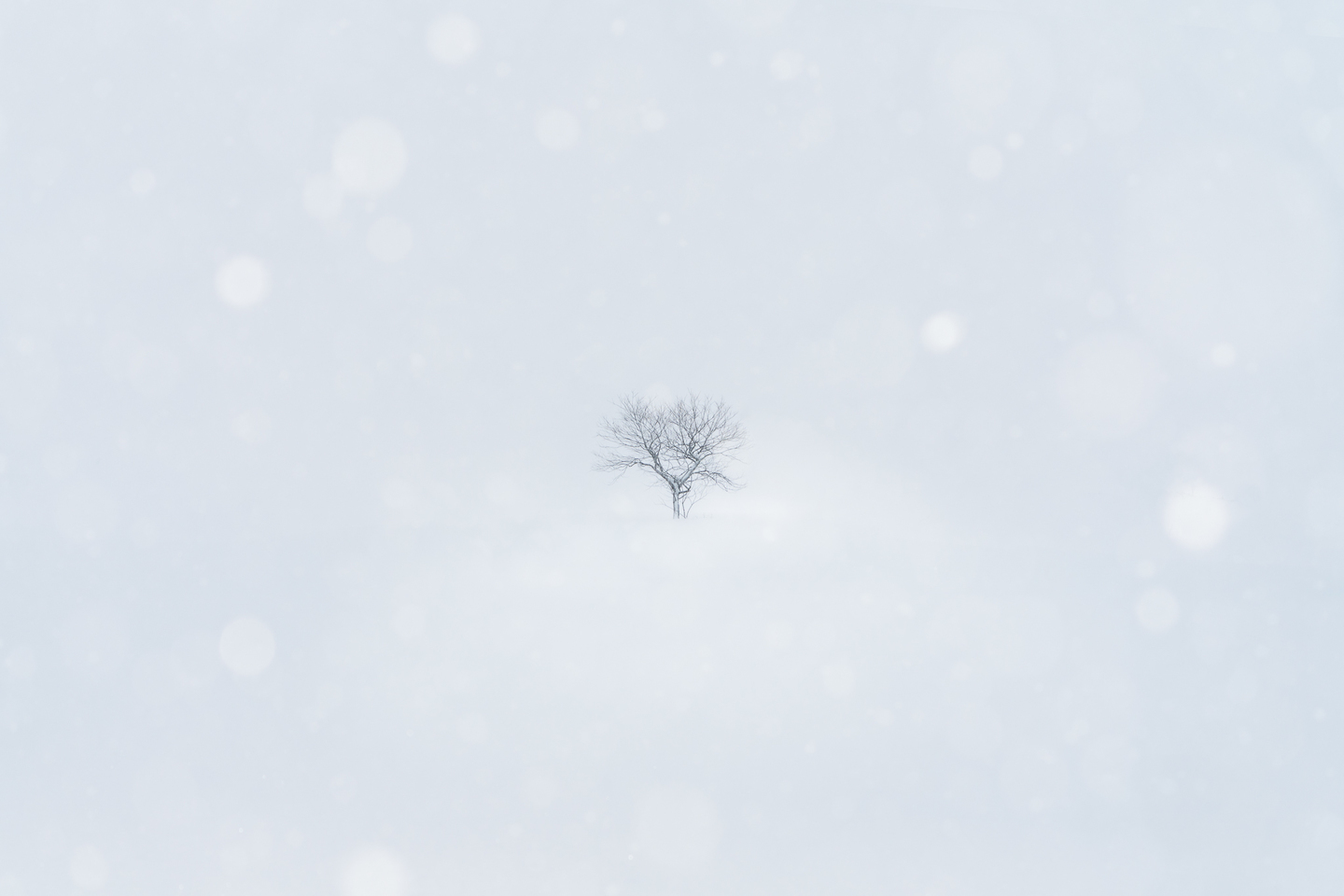 青森の八甲田周辺で撮影した1枚。突然の大雪に見舞われ、吹雪で荒れた天候でしたが、通りかかった森の中で印象的なシーンに出会えました。