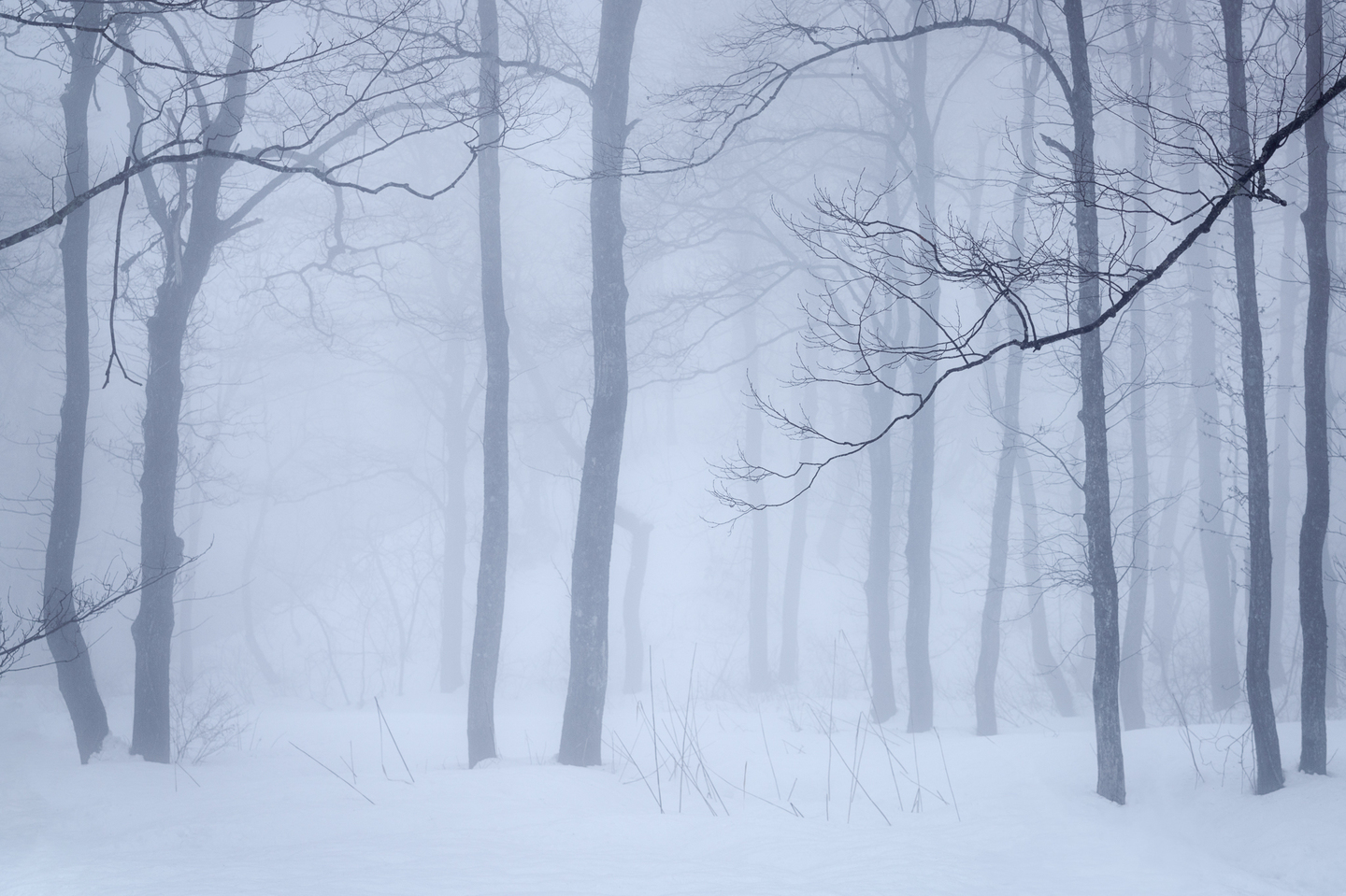 降りしきる雪によって霧に包れたような雰囲気の森を撮ってみました。雪によって森の表情も普段とは全然異なるのが面白いですね。