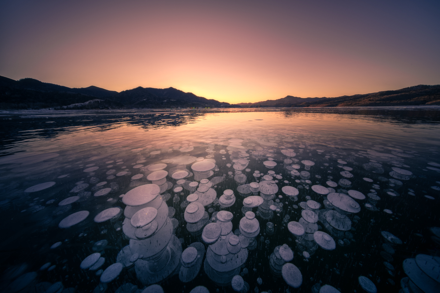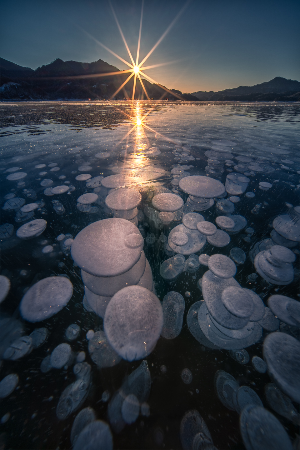 ある特別な条件が必要ですが、冬の凍った湖面ではこのようなアイスバブルと呼ばれる現象を撮影することができます。