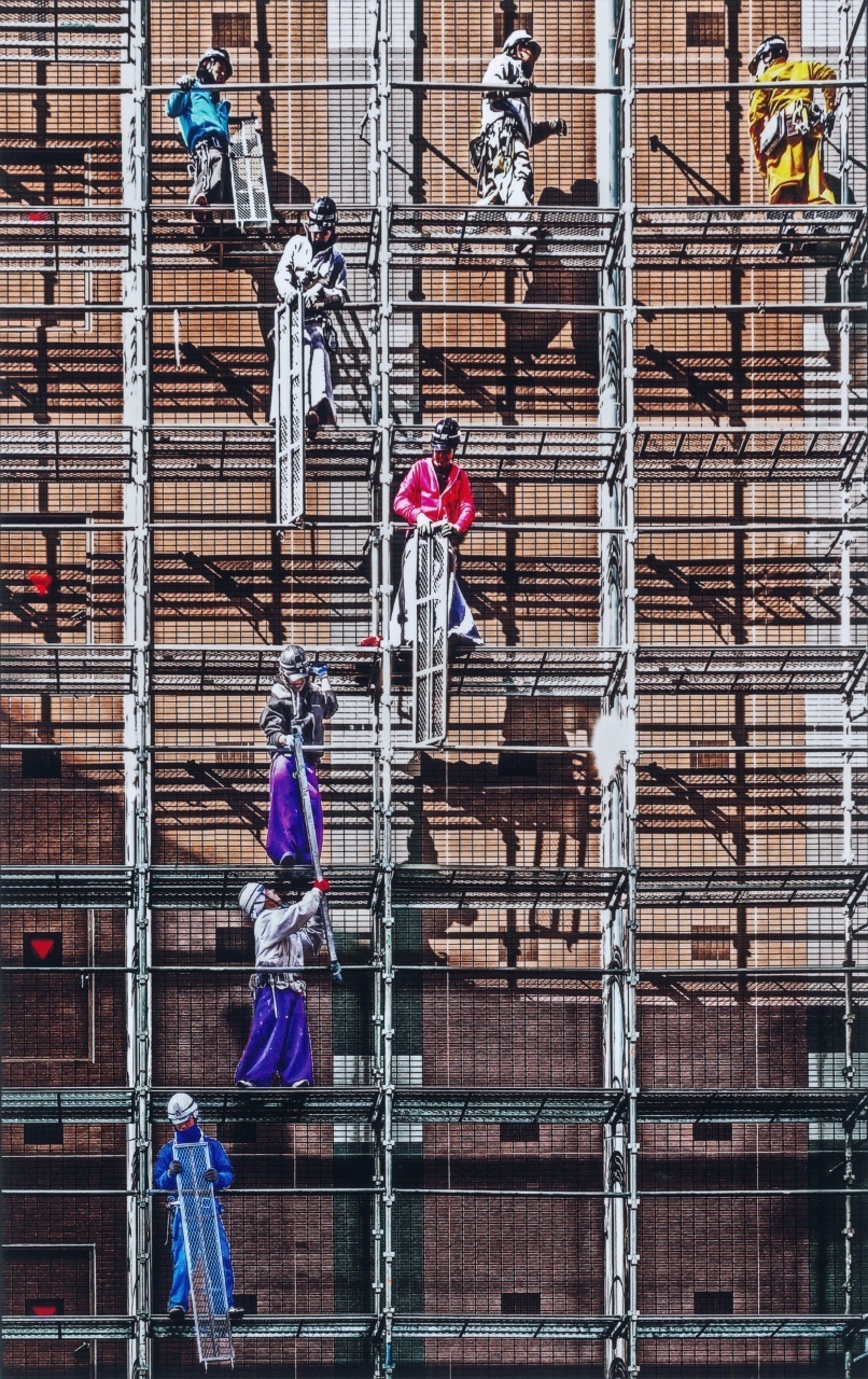 マンションの足場工事作業を巧みに画面構成した洒落た作品です。垂直線と水平線を基調に、作業員の動きや服の色の点在もバランス良くまとまっています。まるでシフトレンズでも使ったように垂直がきちんと出ていることで、さらにその効果を上げました。