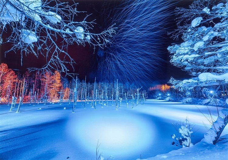 恐ろしいほどに美しく幻想的な雪の光景です。画面の上部に配置されている照明塔の光軸に向けて吹いてくる雪の動きが圧巻ですね。スローシャッターの効果が抜群。唯一この部分が動きを感じさせ、ほかの静かな部分と対比することで良いポイントになりました。赤いカラマツの点在も奥行きを感じさせ効いています。