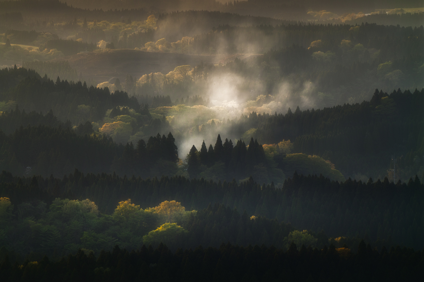 熊本・阿蘇にて。360度見渡せる場所から望遠ズームレンズで光があたっているポイントを中心に、バランスの良い構図を決めて撮影しました。
