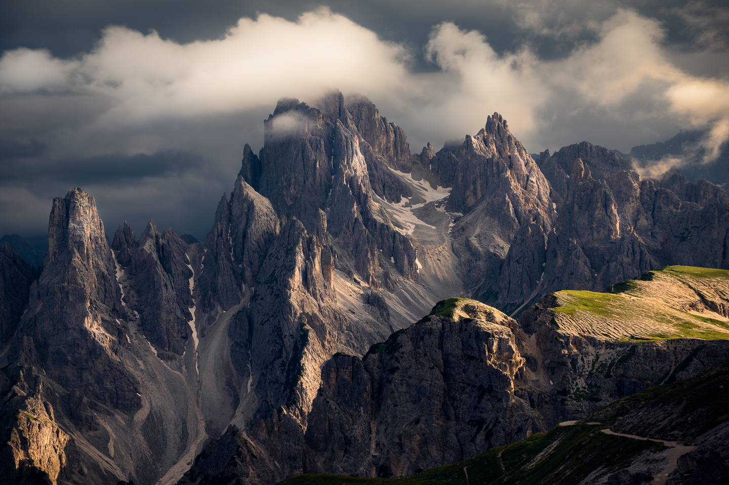 イタリアのドロミテで撮影した写真ですが、別の撮影地に向かう途中に遠くに見えた山脈と雲と光の作り出す雰囲気が気になり、登山道の途中から望遠ズームレンズで狙って撮っています。