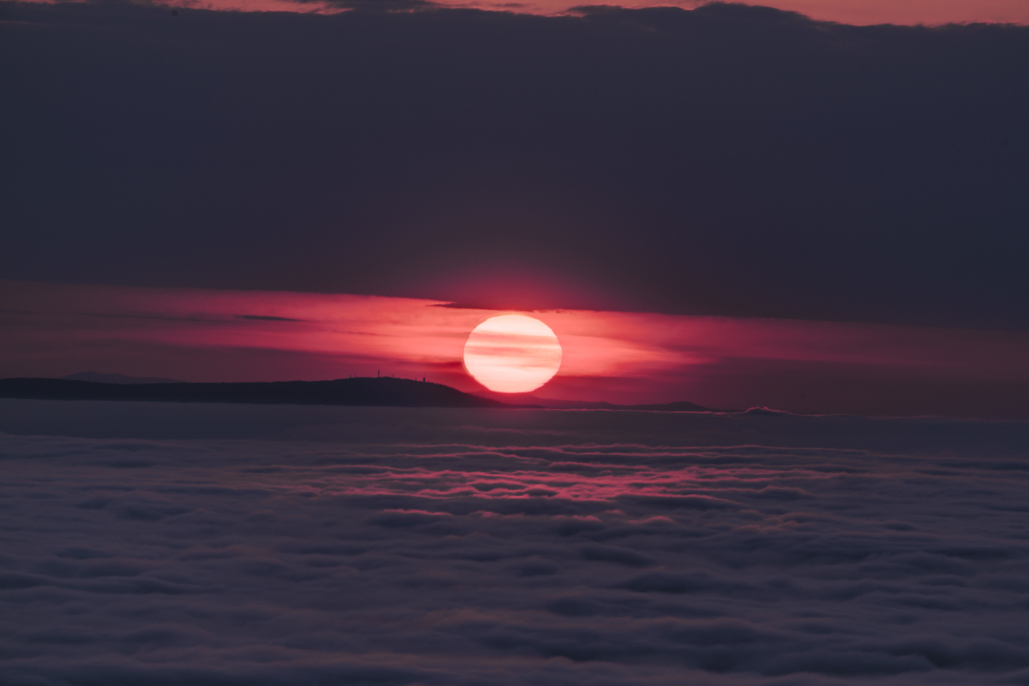 雲海と夕日。広大な雲海を広角レンズでも撮影していましたが、日が落ちる直前に雲の隙間から綺麗な夕日が出てきたので、慌てて望遠ズームレンズを装着して撮影した一枚。