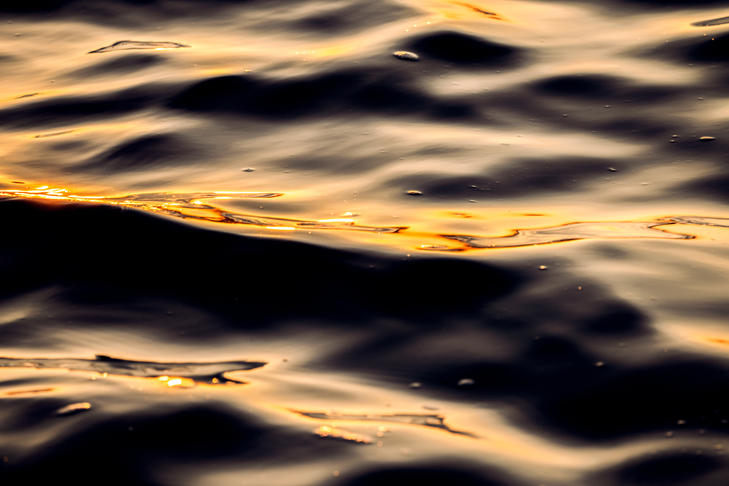 夕日で黄金に輝く海面や、湖面などを望遠ズームレンズでクローズアップして撮ることで、抽象的な表現も可能になります。揺れる水面の場合、シャッタースピードを少し変えただけでも大きく表情が変化するので、いろいろなシャッタースピード設定で撮影してみると面白いと思います。