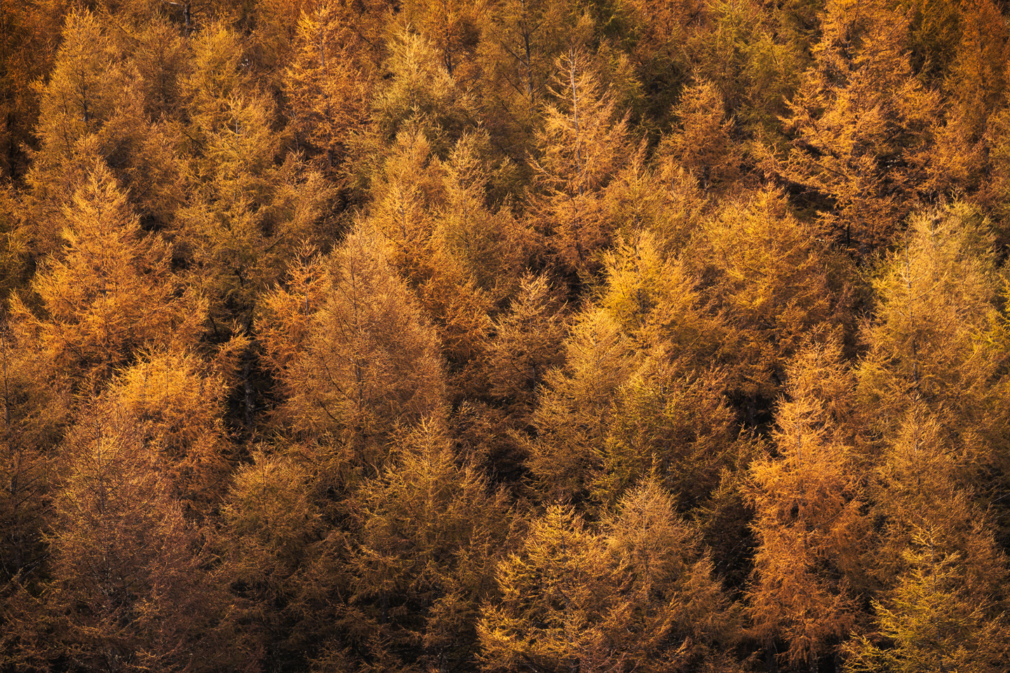 秋のカラマツ林。高解像度カメラとの組み合わせで繊細な木々の様子を描写できるのも、望遠ズームレンズの醍醐味です。