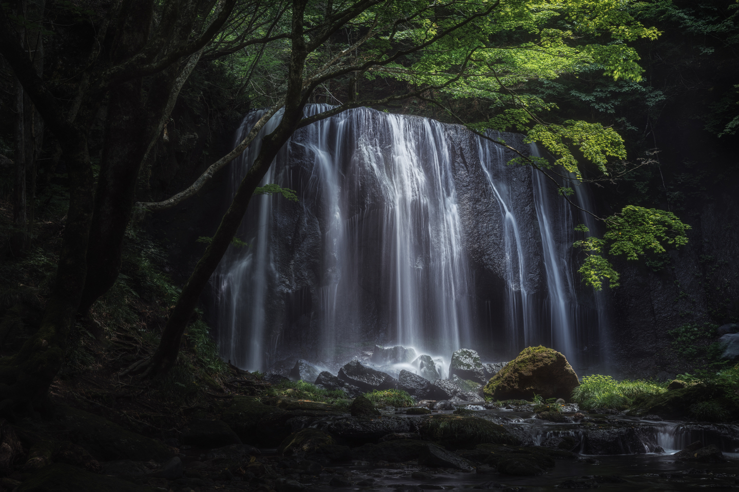 福島の有名な滝である、達沢不動滝での一枚。光り輝く繊細な滝の流れと木々の美しさを意識しながら撮影しています。