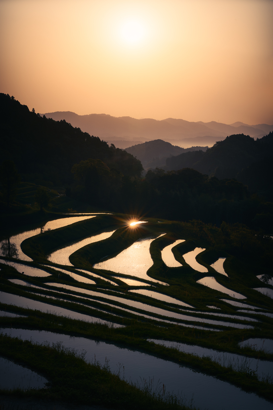 千葉県鴨川市の大山千枚田での一枚。縦構図にすることで、標準域でも空と手前の前景の両方を入れることで、広大なシーンでの奥行き感を出しています。