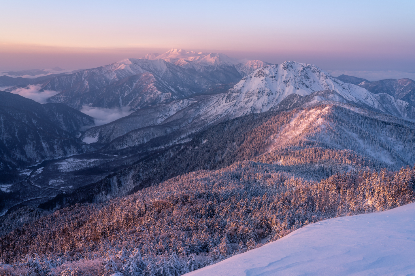 雪山撮影での一枚。雪で一面真っ白い世界が朝日の光で徐々に色づいていく瞬間がとても美しいですね。筆者の場合、登山時は機材軽量化のために、なるべくカバーレンジが広い標準ズームレンズを持っていく場合が多いですね。