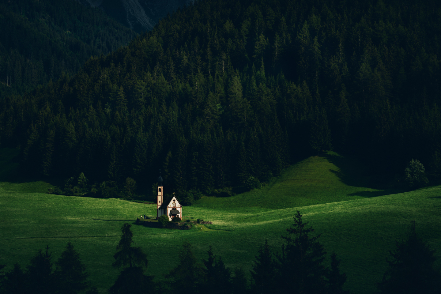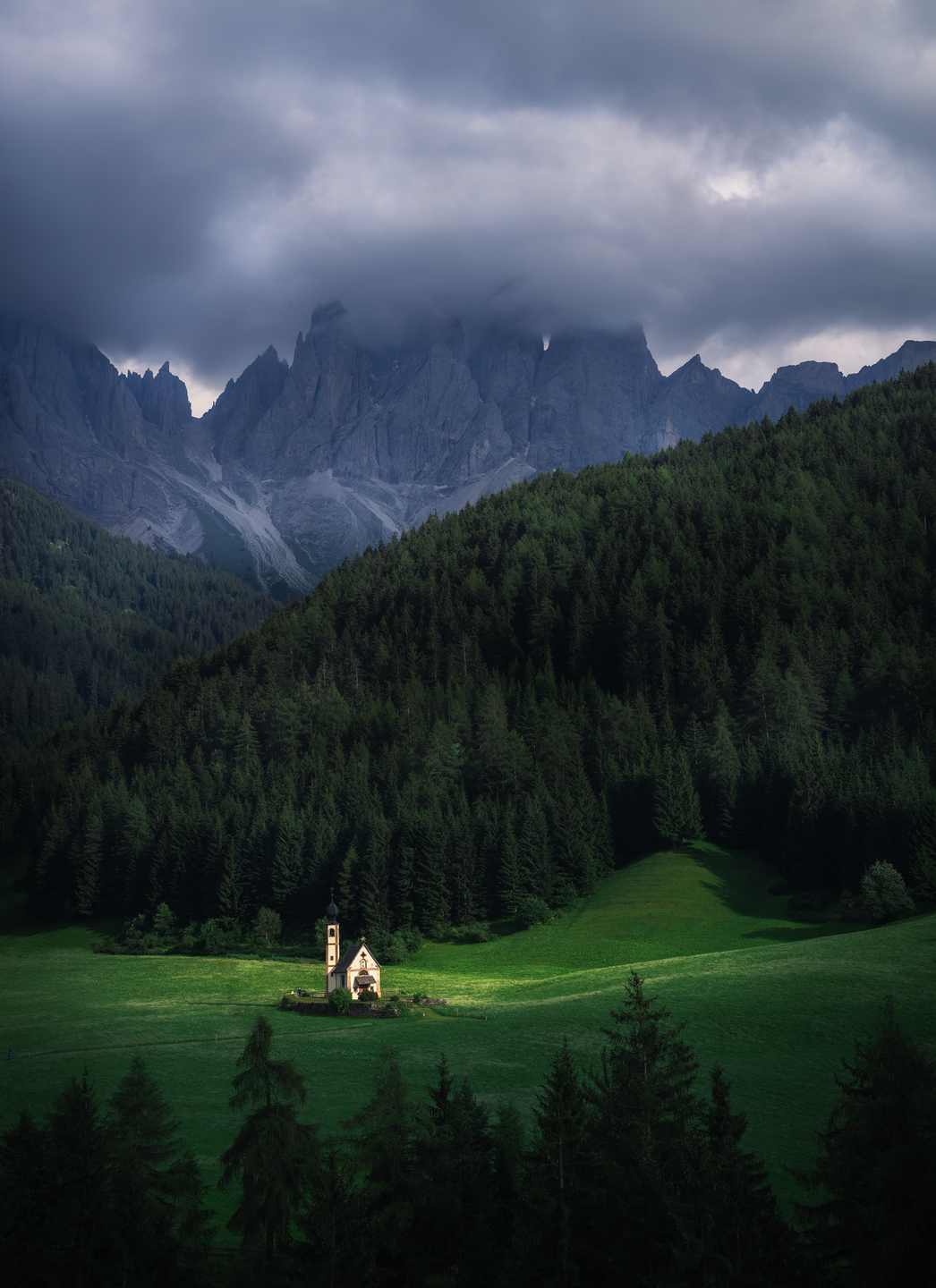 下の写真は教会と後ろの険しい山を一緒に撮りたいと思ったのですが、撮影場所である丘を登る際に広角レンズを持ってこなかったので、急遽パノラマ撮影したものです。80mmくらいの焦点距離で撮影した写真を縦に3枚つなげて合成しています。