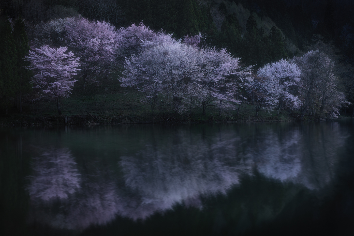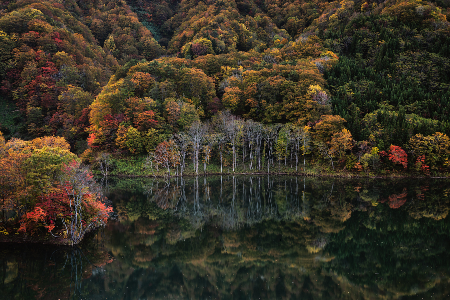 秋の白神山地の周辺での撮影中、車で通りかかった際に一瞬気になる風景が目に飛び込んで来たので、急遽車を停めて撮影した一枚。いつまた風で水面が揺れて水鏡が撮れなくなるか分からなかったため、素早く撮影する必要がありました。