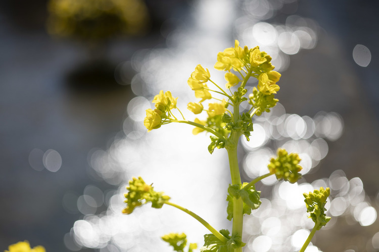 下の菜の花の写真は背景に写る水面反射のボケを奇麗にするために、あえて絞りを浅くして撮影しているので、特にピント合わせに苦労しました。ここでは三脚は使わずにある程度ピントを合わせたら、そこからはピントリングでピントを調整するのでは無く、身体をゆっくりと動かしてピントを合わせてシャッターを切っています。