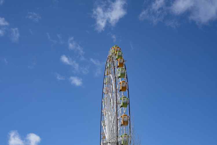 青空のもとのカラフルな観覧車。とても自然な発色とシャープな描写をしています。