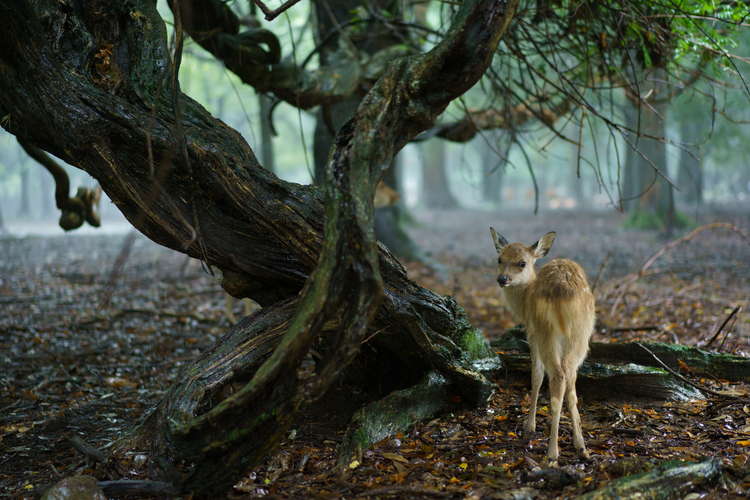 大雨の奈良公園で雨宿りをする小鹿。暗い状況の手持ち撮影でも開放F値が明るいと速いシャッターが切れるのでカメラブレのリスクが減ります。