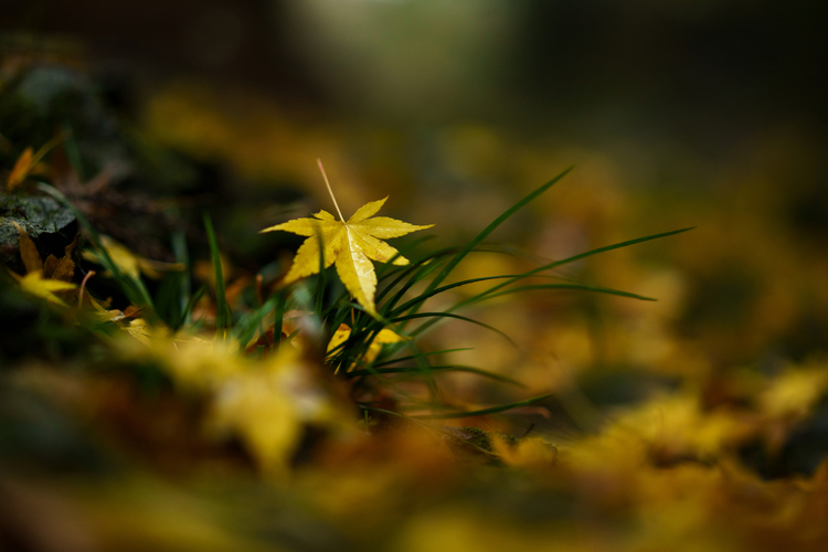 開放F値が明るいと焦点距離が長くなくてもボケ表現が可能。濡れた落葉に最短撮影距離まで近づいて撮影しました。望遠的なボケ具合に見えますが背景の入り具合は望遠のそれとは違い、奥行を感じさせるものになっています。標準域(50mm前後)のレンズは使いようによって望遠的表現と広角的表現を使い分けることが出来ます。
