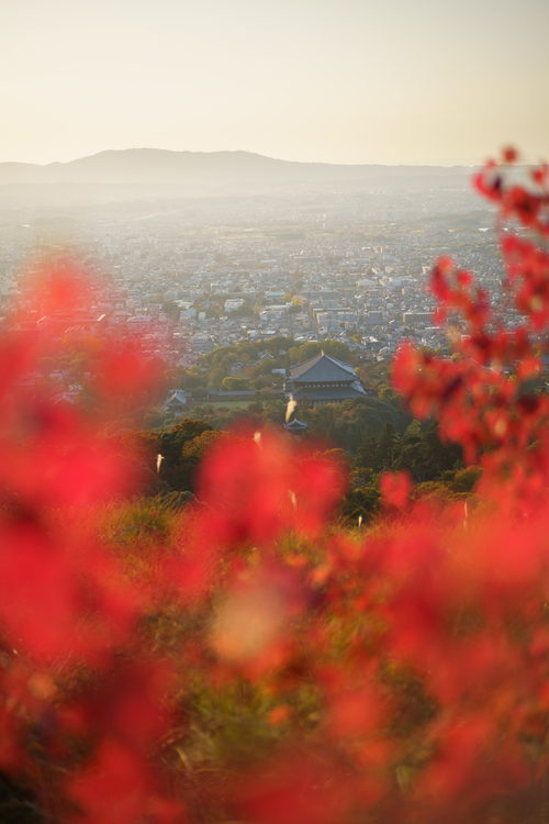 若草山(奈良県)より東大寺大仏殿を遠望。大きな前ボケを作りつつ、風景全体をおさめました。きっとズームレンズだと前ボケが中途半端になってしまったでしょう。