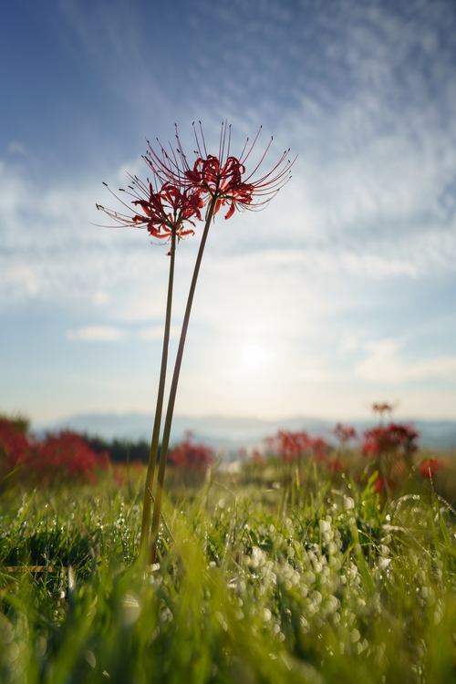 彼岸花を主役に朝露で玉ボケを作り背景をぼかしました。風景の広さを広角域で描いています。