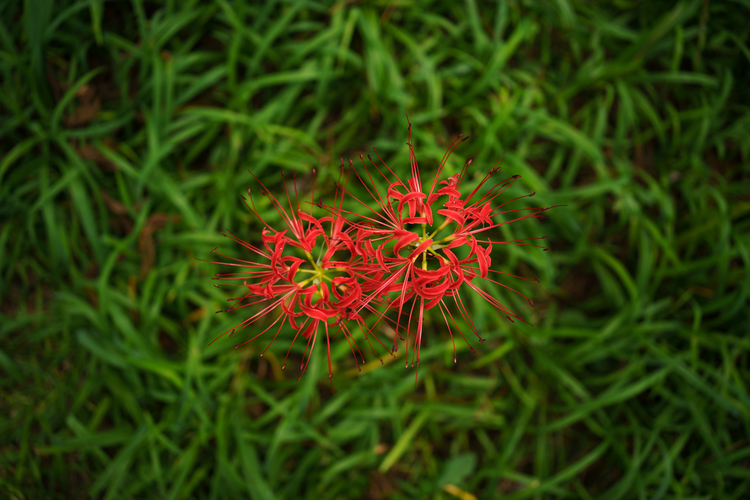 背景の雑草が彼岸花の花びらとシンクロしているよう。この時、手元にあったズームは開放F4のものだったので単焦点レンズに交換。真上からの撮影で花と地面は比較的近いのですがF2.8でぼかすことが出来ました。