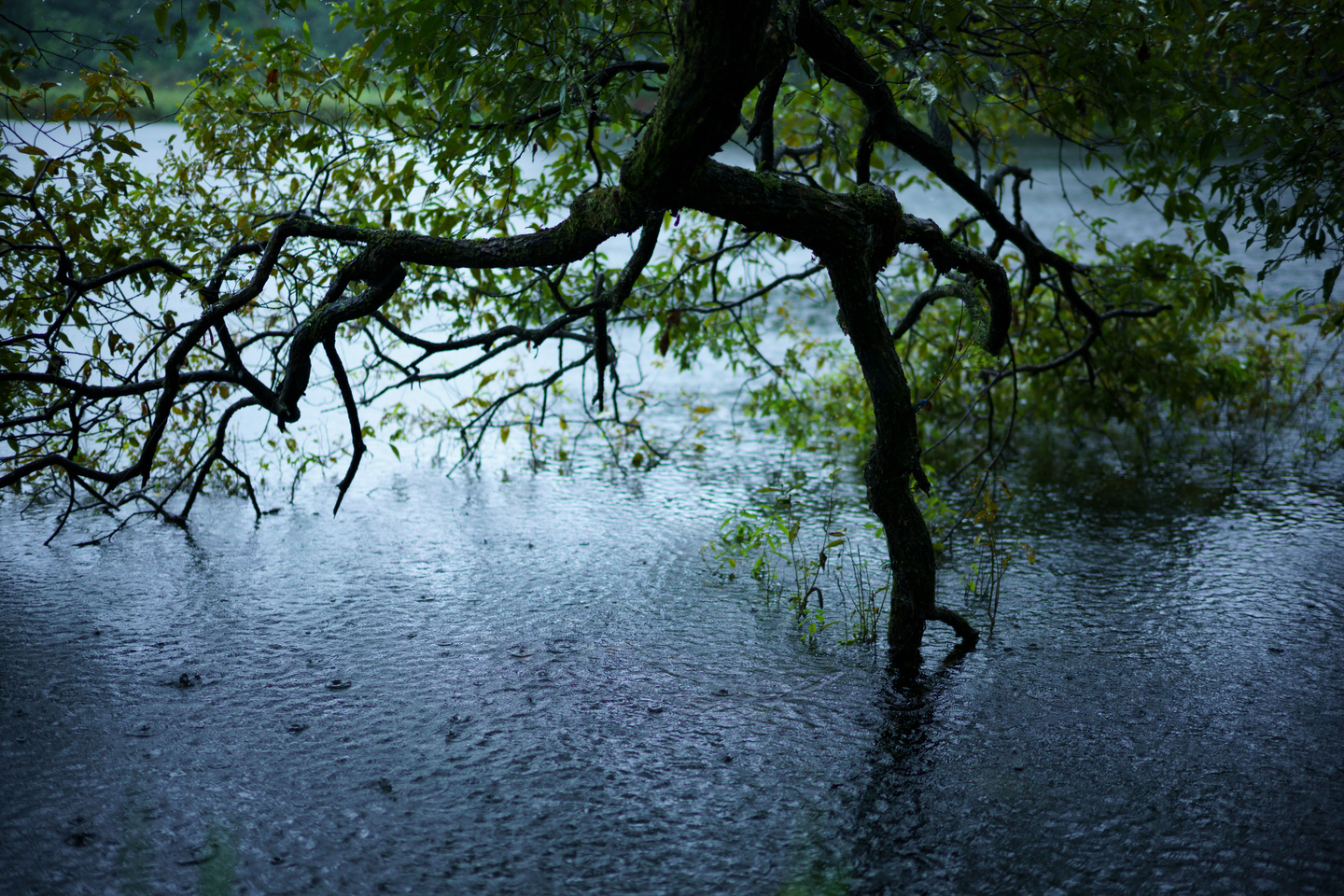 肉眼での遠近感に近い描写の標準域は、初めて単焦点を持つ人にも使いやすいと言えます。木の手前と雨が打ち付ける水面に浅くピントを合わせて奥をぼかすことで遠近をつけています。