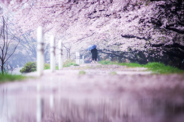 満開の時期でも川沿いの団地の人が散歩に来るくらいの桜並木。雨が結構強く降っていたので人はいないだろうけど、面白い写真が撮れたら良いなと思い家を出た。誰もいないと思ったら、長靴を履いたおじいさんが自分の後ろからやってきて土手の上を歩き始めた。