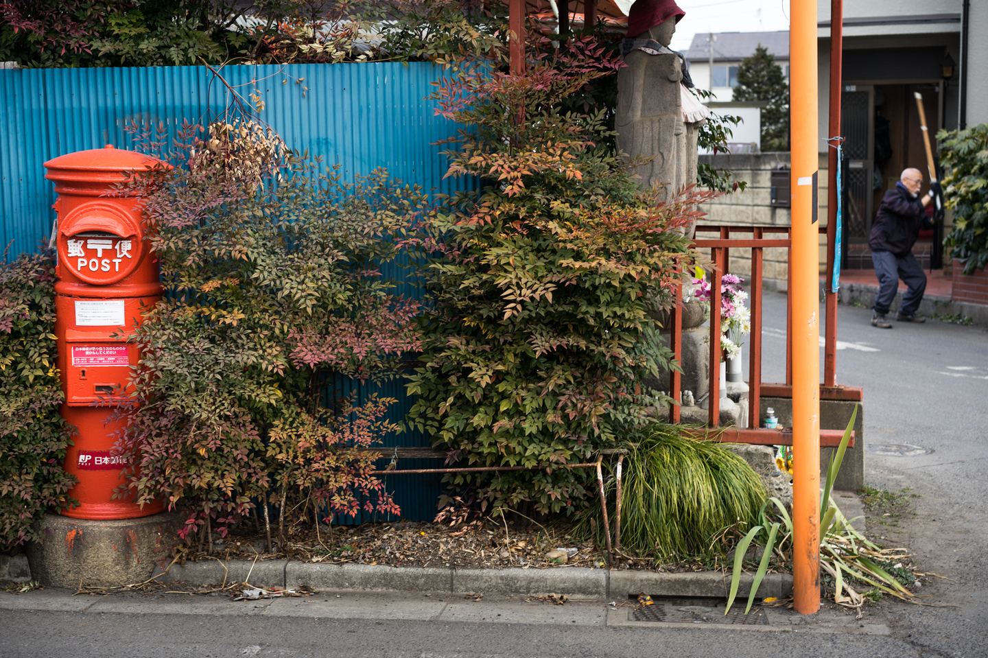 カメラの光軸を人に直接向けると素振りをやめてしまいそうなので、少しずらして、ポストとの中間少し右に。あとは竹刀を振りかぶっているところでシャッターを切った。こんな思いがけない場面でも焦らず構図を作る。単焦点なので壁ぎりぎりまで下がってポストと竹刀を持った方を左右ギリギリに、真ん中に好きな南天の木と青いトタンが揃い、バッチリの構図となった。