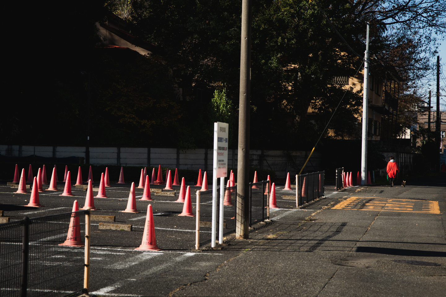 ここは古い団地の駐車場で、数年前に団地の取り壊しが決まってから駐車場には赤いカラーコーンが立ち並び、面白い光景になっている。そんな中、赤い服を着ている人が現れたので赤い服とカラーコーンの大きさを合わせてシャッターを撮ってみようと思った。