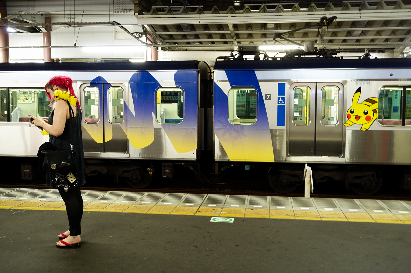 電車を降りたらピカチューの電車と、あきらかにピカチュウ好きの女性が目についた。普段なら電車が水平になるところにささっと移動して撮るところだが、ここは瞬間の方が大事。素早くカメラを取り出し撮影した。微妙に斜めになったが、写真の内容的に構図がどうかというものではないので、これでいいかなと。構図も大事だが瞬間はもっと大事で意識した方がいい。