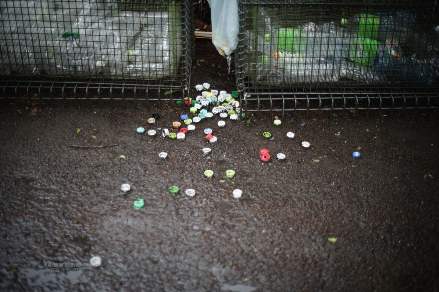 濡れた地面で手前に向かって放射状に蓋が広がって落ちているのを面白く感じて撮影した1枚。真上から撮るか悩んだが、左下の一個をこの位置にすることで広がりを感じる様な構図で捉えることにした。寄りたくなる場面でも、じっくり撮れる場合は引いて全体をよく見る癖をつけてみるといいと思う。