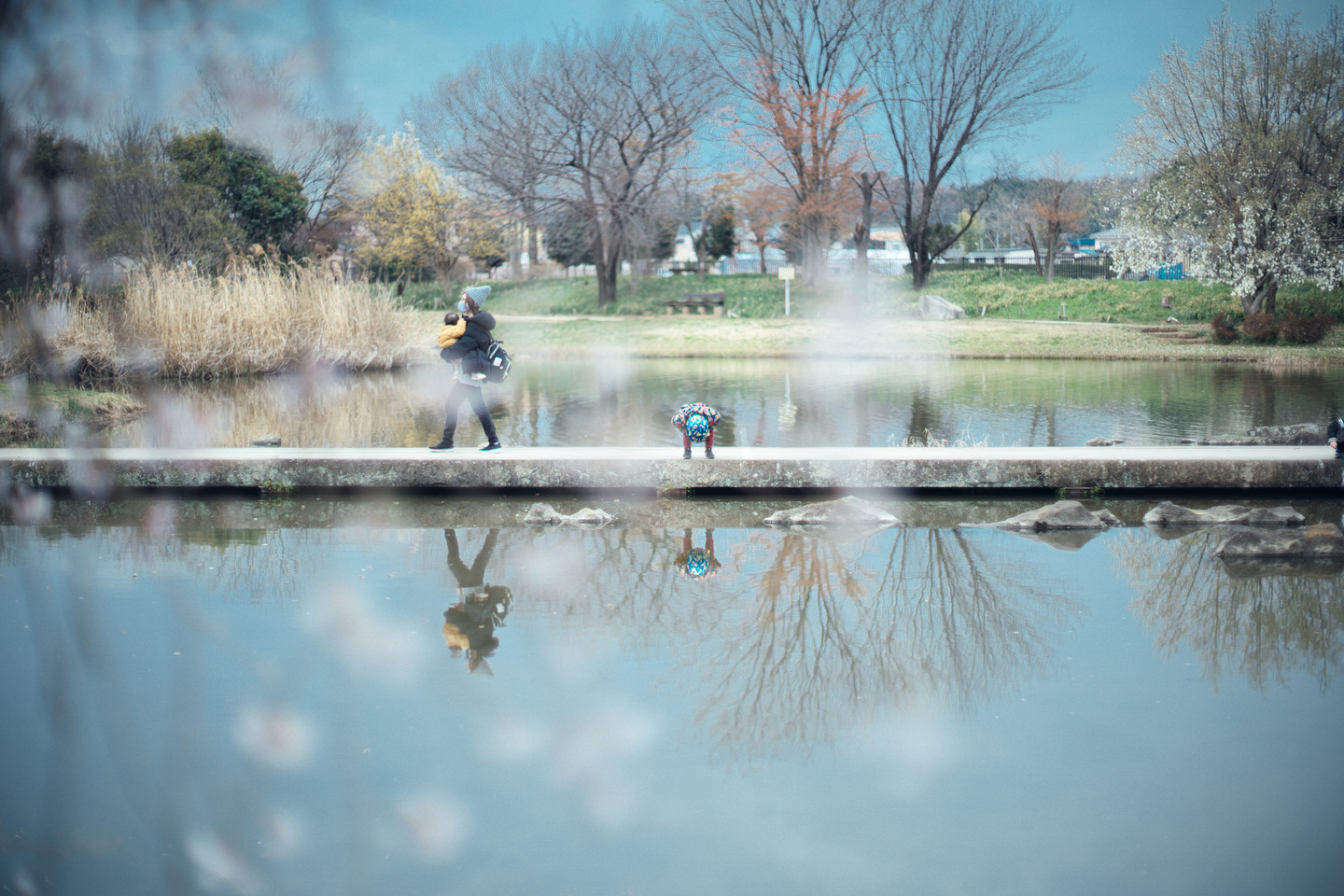 桜の時期、ここではいろんなパターンの写真を撮っているので、ただ人が通るだけでシャッターを切ることはないのだが、ヘルメットを被っているちびっこが池の中を覗き込んでいる場面にでくわしたら話は別。このまま池に落ちてしまわないかとひやひやしながらシャッターを切った。ヘルメットの可愛らしさを出す為にしだれ桜越しにマニュアルフォーカスでヘルメットにピントを合わせた。こんな感じで普段なかなか出くわさない場面でも観察を行い、どのような構図が良いかを見極めることがとても大事なことだと思う。