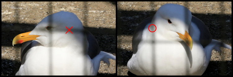 この時にもう一つ重要なのがカメラと檻と動物の位置関係です。動物は檻から少し離れているところにいるものを探し、カメラはなるべく檻に近づきます。ファインダーをのぞいてみると思っている以上に檻が見えなくなっています。しかし、オートフォーカスは手前のものにピントを合わせようとすることが多く、檻にピントが合ってくっきりとしてしまうことがあります。この対処方法は、フォーカスフレームを1点にして、檻の隙間から撮影したい動物に重ね合わせると良いです。それでもうまくいかない場合は、マニュアルフォーカスに切り替えてピントリングを回しながら動物がシャープに見えたところで撮影します。