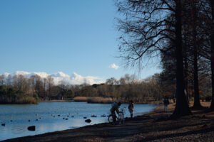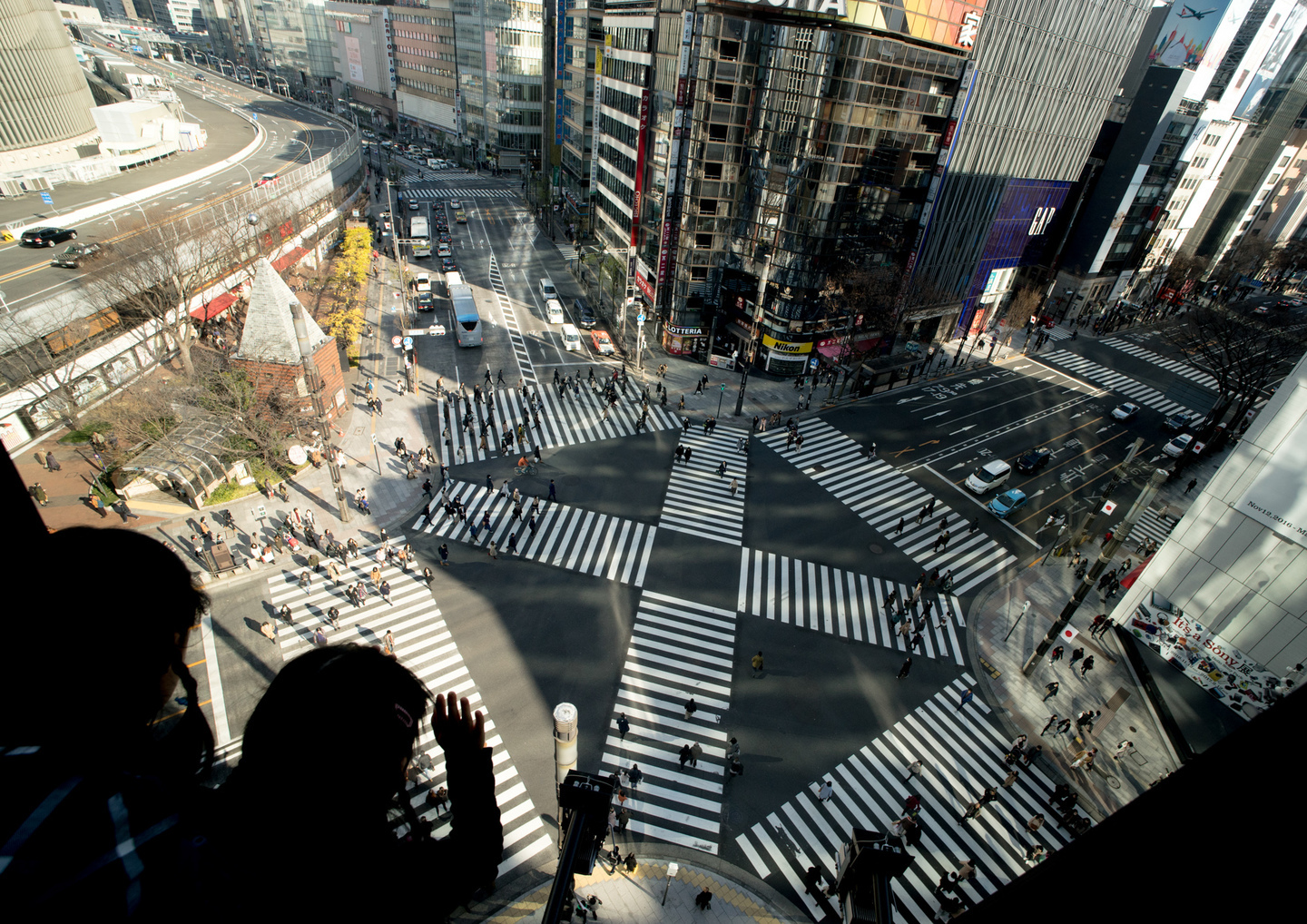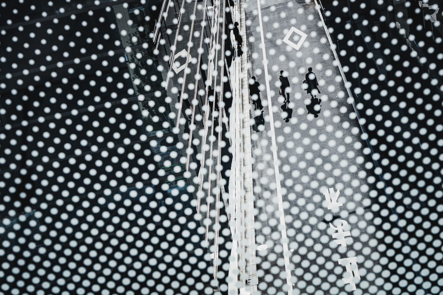 銀座以外ではなかなか見ることがない建物の4階屋上にある新しくできた公園。遊具も特になく屋上にあること以外は特徴もない公園だが、水玉模様のガラスの塀が特徴的で太陽の光が当たるとこの模様を生かした面白い写真を撮る事ができる。ここで大事なのは手前の丸をぼかしてしまうと特徴が薄くなってしまうのでF8~F16辺りまで絞ることだ。こうする事で沢山の丸をしっかり丸く、道路の人もくっきり写すことが出来る。あとは道路のダイヤと止まれの位置で構図を微調整。主題の三人を目立たせるため、先のごちゃごちゃした景色は写さないようにレンズを下に向けて写し止めた。
