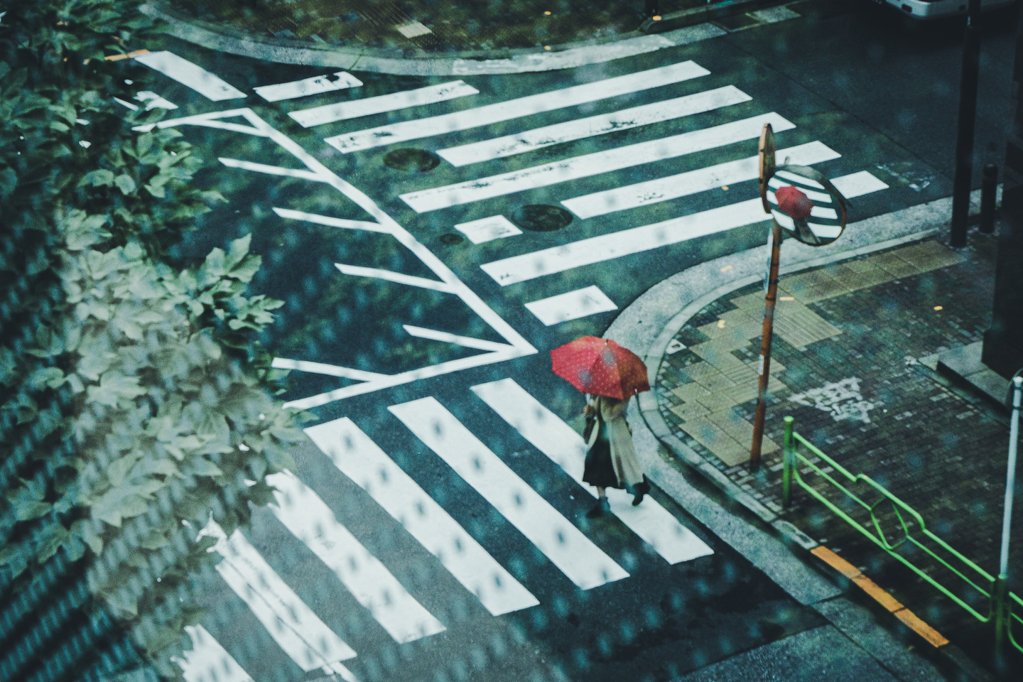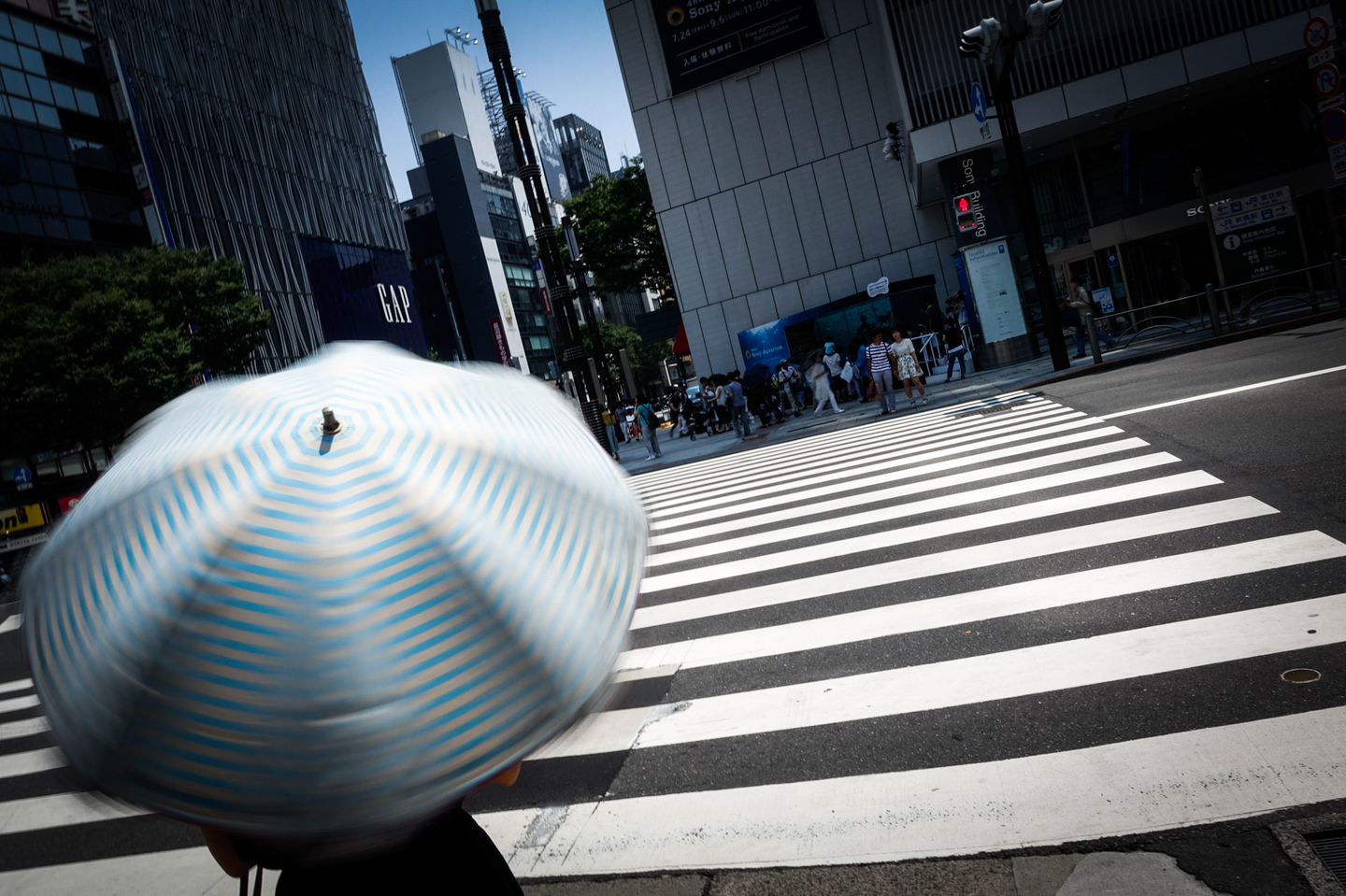 特に撮るような場面でもなかったのだが、女性が突然傘をくるくる回しはじめ、これは!と思いカメラの設定をシャッター優先の1/20秒に変更し、回っているのがわかる様に撮ってみた。こんな感じで街で突然現れる出来事を普通に絞り優先で撮っていては表現ができないなと思った時は、撮影モードをシャッタースピード優先にすることをオススメする。人間、車、電車でも1/20秒辺りにすると面白い絵になる事が多い。傘が丸いので画面の真ん中にもっていっても面白い絵になったと思うが、傘のラインと、交差点のラインを合わせることができたので写真に深みが出たかなと思う。