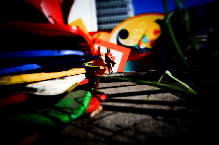 銀座から少し離れてしまうが、八重洲通にあったフードコート。カラーコーンが重ねて置いてあるのは特に珍しくもないが、これだけ違う色でカラフルに重ねてあるのは初めて見たので、面白く撮れないか色々と悩んでみる。三角のコーンの形が分かると引かないといけなくなるので、沢山の色の重なりが見える下の部分を超広角レンズを装着したカメラで寄ってみた。真ん中にオレンジの服の人を入れようとすると右側の空間に入れるものはほぼ決まってしまうが、真っ青な空と草の緑を少しでも入れることによって右側とのバランスを取った。