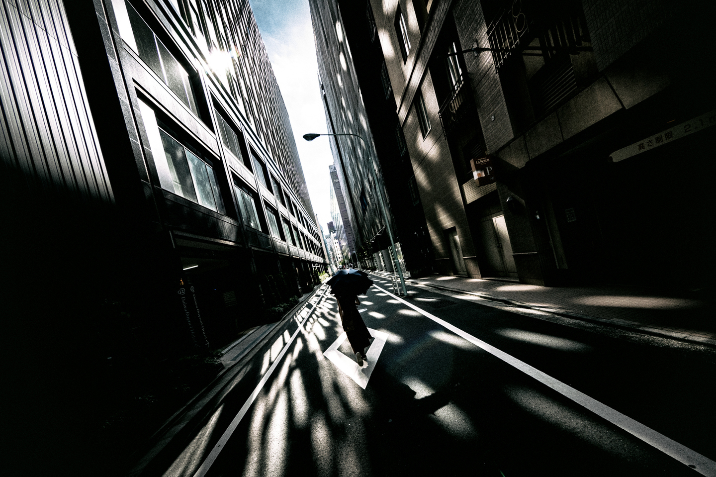 この場所は、この通りを歩いていた時に見つけた訳ではなく、離れた所からビルの壁に複雑な光が見え、近づいてみたら道路にまでいい光が差し込んでいた。この場面で大事だと思うことは超広角レンズを装着したカメラをできるだけ高い位置に持って行き、レンズの光軸を少し下に傾けること。こうする事で道路にある点々の光を沢山取り込めるのと、奥行き感を出すことが出来る。また少し斜めにすることで広がり感を強調した。後ろから来る人を正面に通って貰うために真ん中で構えず端に避けて誘導。道路のダイヤマークと重ねる事によって人の形が引き立ち、想像以上の絵になってくれた。