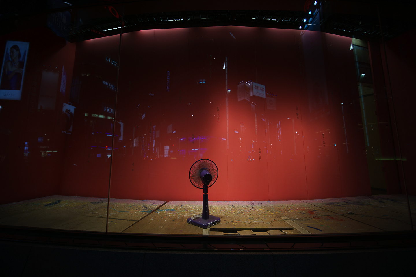 銀座で一番いい場所にある有名なショーウィンドウ、数か月に一回の入れ替えの日にたまたま通りかかった。扇風機だけがスポットライトが当たり真ん中で回っているシュールな状況。寄って撮ると状況が分かりにくくなるので、引いてガラスの中に反射している銀座の街が分かるくらいの露出で撮ってみた。こんな風にまず、些細な事でも面白いって思うことが大事だと思う。そしてそれをどう面白く表現していくか。寄って行くと選択肢が減る気がするので自分はまず引いた状態から、どこまでを入れるのが良いかを考えるようにしている。