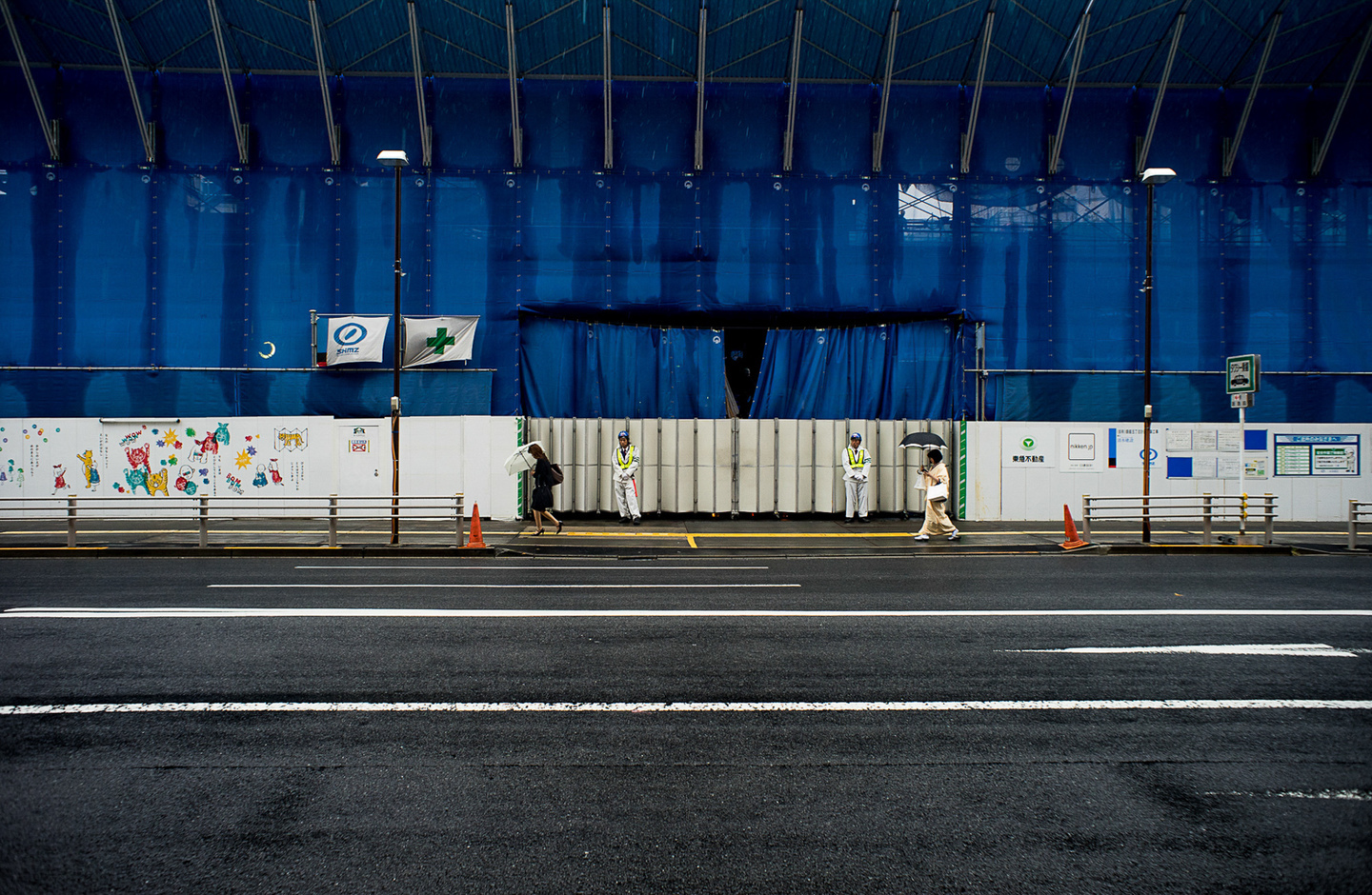 工事現場のブルーシートが好きでよく撮っているのだが、迫力のあるこの大きさ、雨で模様ができていたのと、警備の2人が暇そうにしているのが気になりシャッターチャンスを伺っていた。そこに和服の方が歩いてきたのでバランスを考えてシャッターを切った。このように大きく建物を入れるときは水平、垂直をかなり気にしている。あとは人の間隔と足の開き具合。この4人が少しでも意味がある所で写し止めたいと考えている。